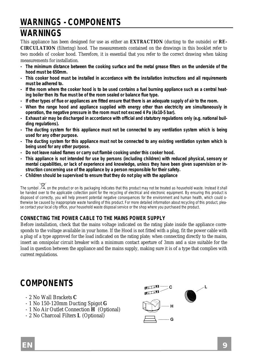 WARNINGS - COMPONENTS WARNINGS This appliance has been designed for use as either an EXTRACTION (ducting to the outside) or RECIRCULATION (filtering) hood. The measurements contained on the drawings in this booklet refer to two models of cooker hood. Therefore, it is essential that you refer to the correct drawing when taking measurements for installation.