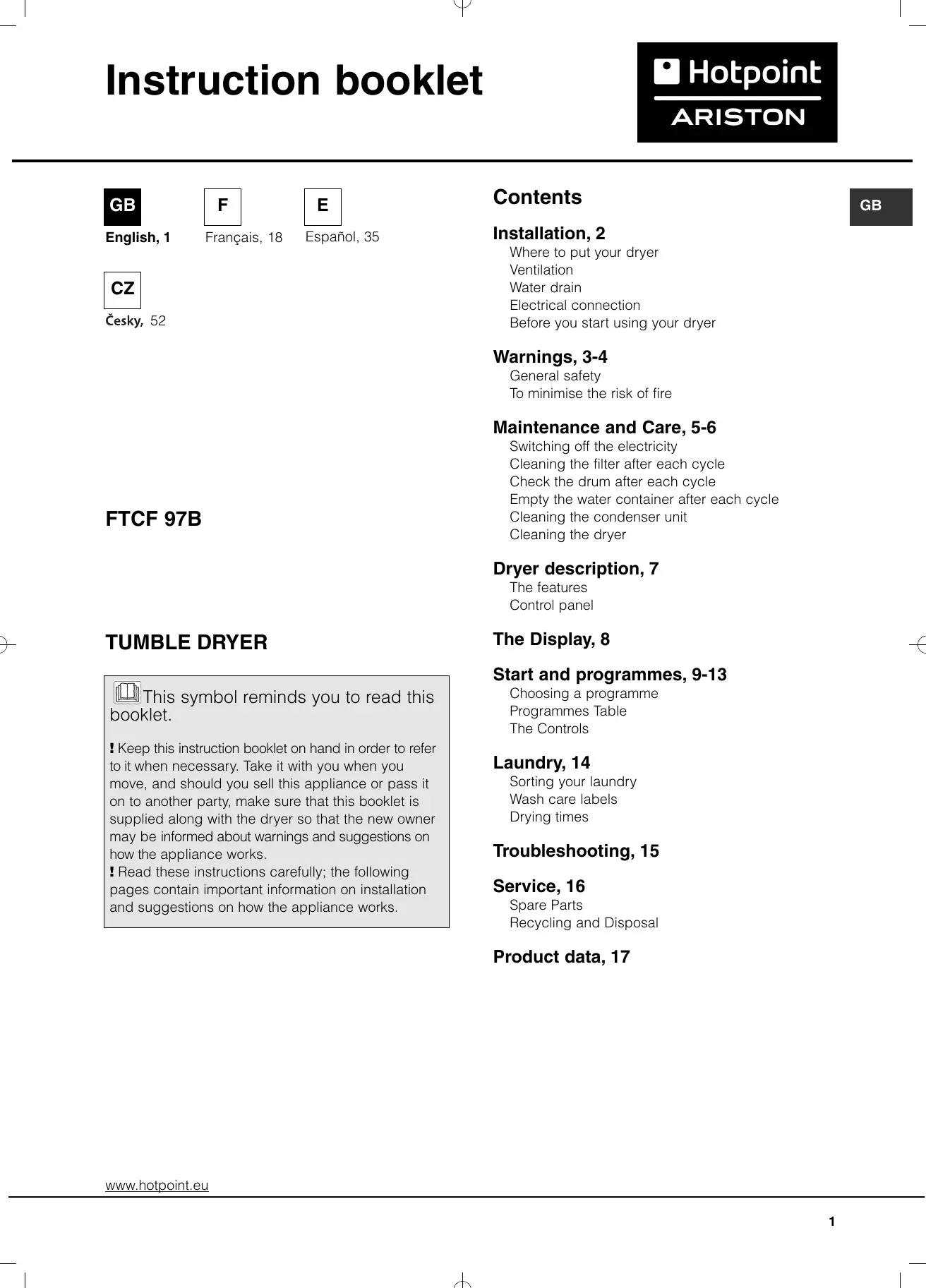 Installation, 2 Where to put your dryer Ventilation Water drain Electrical connection Before you start using your dryer Warnings, 3-4 General safety To minimise the risk of fire Maintenance and Care, 5-6 FTCF 97B Switching off the electricity Cleaning the filter after each cycle Check the drum after each cycle Empty the water container after each cycle Cleaning the condenser unit Cleaning the dryer Dryer description, 7 The features Control panel TUMBLE DRYER The Display, 8 Start and programmes, 9-13 This symbol reminds you to read this booklet. ! Keep this instruction booklet on hand in order to refer to it when necessary. Take it with you when you move, and should you sell this appliance or pass it on to another party, make sure that this booklet is supplied along with the dryer so that the new owner may be informed about warnings and suggestions on how the appliance works. ! Read these instructions carefully; the following pages contain important information on installation and suggestions on how the appliance works. Choosing a programme Programmes Table The Controls Laundry, 14 Sorting your laundry Wash care labels Drying times Troubleshooting, 15 Service, 16 Spare Parts Recycling and Disposal Product data, 17 www.hotpoint.eu