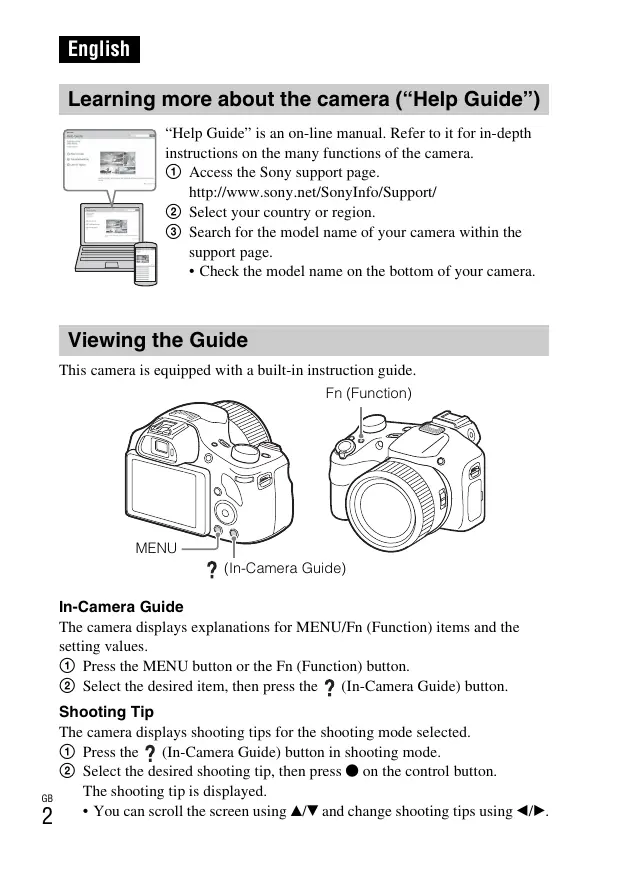 - Check the model name on the bottom of your camera. Viewing the Guide This camera is equipped with a built-in instruction guide. Fn (Function) MENU (In-Camera Guide) In-Camera Guide The camera displays explanations for MENU/Fn (Function) items and the setting values. 1 Press the MENU button or the Fn (Function) button. 2 Select the desired item, then press the (In-Camera Guide) button.
