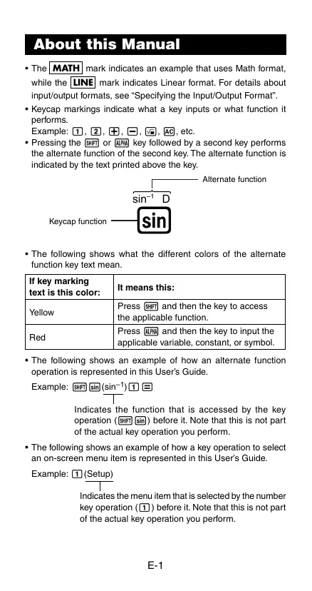 About this Manual + The [MATH] mark indicates an example that uses Math format, wie he [LINE] mark indicates Linear format. For details about inputoutput formats, see “Specifying he Impu/ Output Forma”