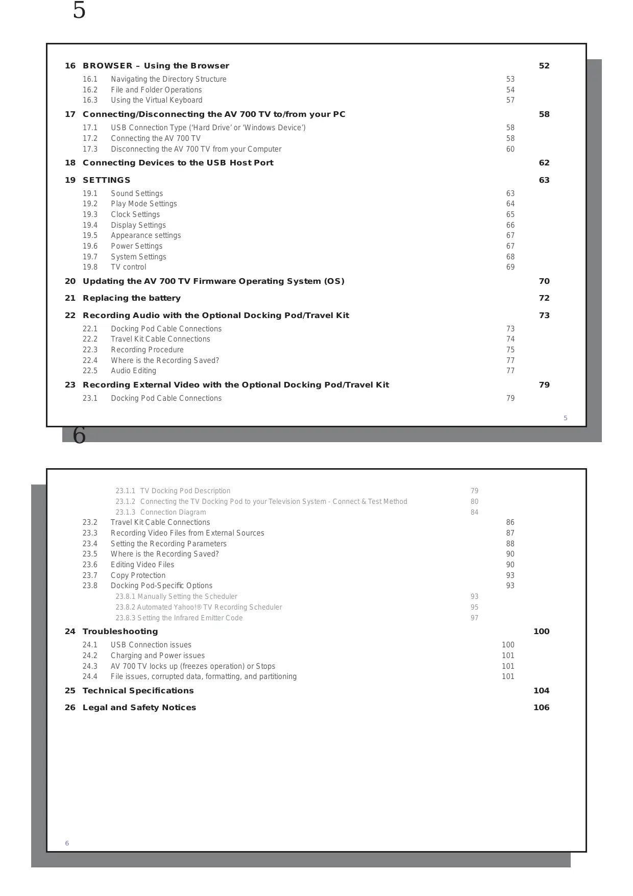 198 TV control Updating the AV 700 TV Firmware Operating System (OS) Replacing the battery Recording Audio with the Optional Docking Pod/Travel Kit 221 Docking Pod Cable Connections