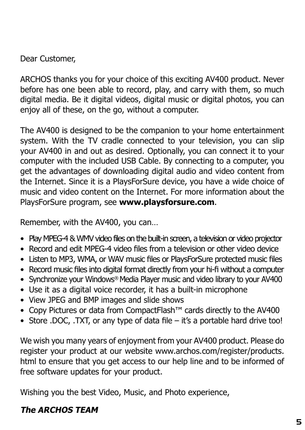 Dear Customer, ARCHOS thanks you for your choice of this exciting AV400 product. Never before has one been able to record, play, and carry with them, so much digital media. Be it digital videos, digital music or digital photos, you can enjoy all of these, on the go, without a computer. The AV400 is designed to be the companion to your home entertainment system. With the TV cradie connected to your television, you can slip your AV400 in and out as desired. Optionally, you can connect it to your computer with the included USB Cable. By connecting to a computer, you get the advantages of downloading digital audio and video content from the Internet. Since it is a PlaysForSure device, you have a wide choice of music and video content on the Internet. For more information about the PlaysForSure program, see www.playsforsure.com. Remember, with the AV400, you can... +_ Play MPEG-4 & WMV video fies on the ui screen, a television or video projector +_ Record and edit MPEG-4 video files from a television or other video device +_ Listen to MP3, WMA, or WAV music fes or PlaysForSure protected music files +_ Record music fils into digital format directly from your hifi without a computer + Synchronize your Windows® Media Player music and video library to your AV400 + Use it as a digital voice recorder, it has a built-in microphone + View JPEG and BMP images and slide shows + Copy Pictures or data from CompactFlash” cards directiy to the AV400 + Store DOC, .TXT, or any type of data fille — its a portable hard drive too! We wish you many years of enjoyment from your AV400 product. Please do register your product at our website www.archos.com/register/products. html to ensure that you get access to our help line and to be informed of free software updates for your product. Wishing you the best Video, Music, and Photo experience, The ARCHOS TEAM