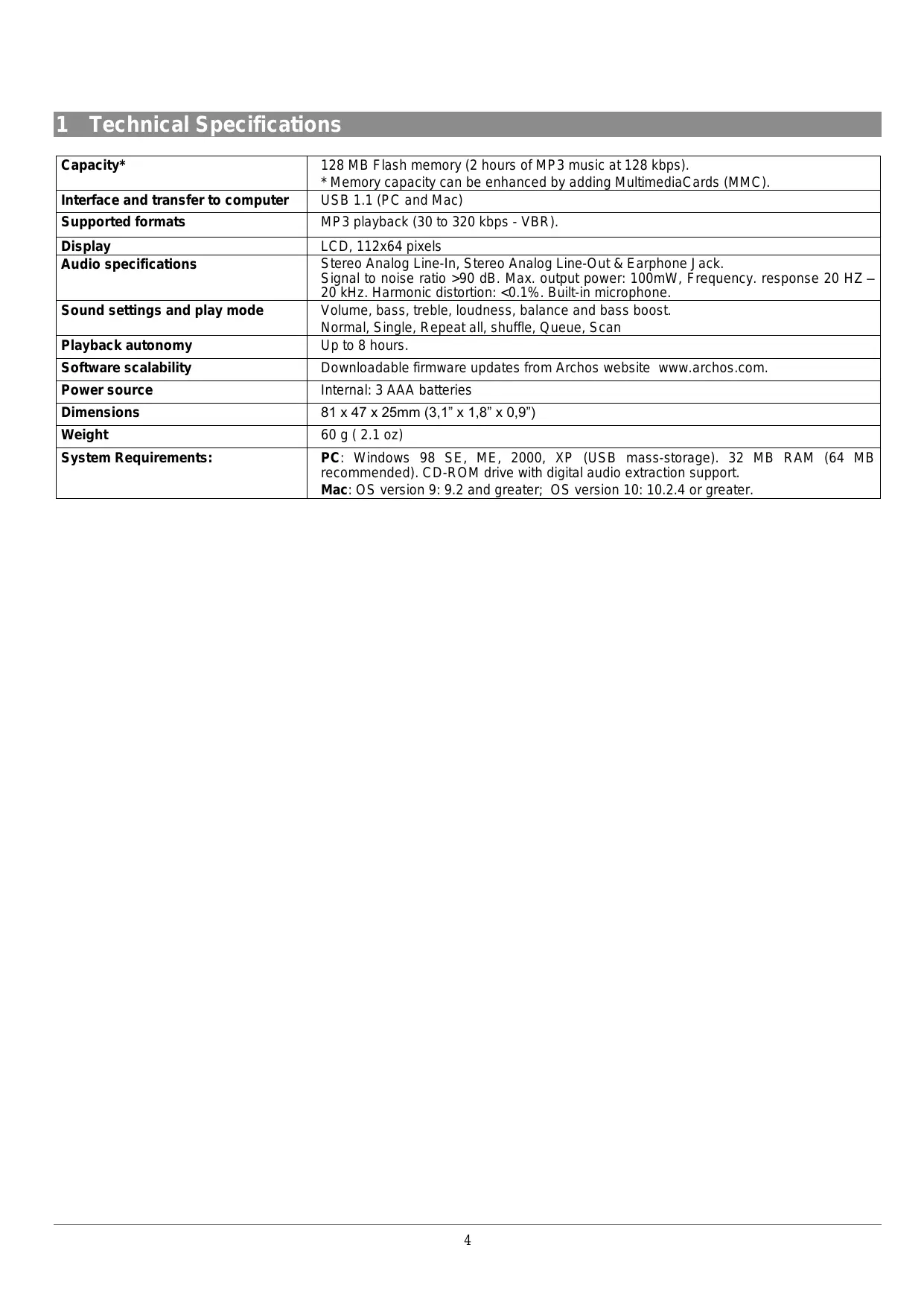 - Memory capacity can be enhanced by adding MultimediaC ards (MMC). Interface and transfer to computer USB 1.1 (PC and Mac) Supported formats MP3 playback (30 to 320 kbps - VER). Display LCD, 112x64 pixels Audio specifications Stereo Analog Line-In, Stereo Analog Line-Out & Earphone J ack. Signal to noise ratio >90 dB. Max. output power: 100mW, Frequency. response 20 HZ — 20 kHz. Harmonic distortion: <0.1%. Built-in microphone. Sound settings and play mode Volume, bass, treble, loudness, balance and bass boost. Normal, Single, Repeat all, shuffle, Queue, Scan Playback autonomy Up to 8 hours. Software scalability Downloadable firmware updates from Archos website www.archos.com. Power source Internal: 3 AAA batteries Dimensions 81 x 47 x 25mm (3,1” x 1,8” x 0,9”) Weight 60g(2.10z) System Requirements: PC: Windows 98 SE, ME, 2000, XP (USB mass-storage). 32 MB RAM (64 MB recommended). CD-ROM drive with digital audio extraction support. Mac: OS version 9: 9.2 and greater, OS version 10: 10.2.4 or greater.