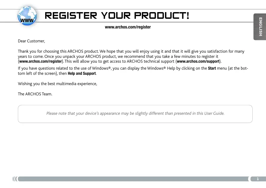 NEED HELP? Here are some ways to find the information you may need: Questions about Windows®? If you have questions related to the use of Windows®, you can display the Windows® Help by clicking on the Start menu (at the bottom left of the screen), then Help and Support. FAQs See the Frequently Asked Questions section on www.archos.com/faq Contact our Technical Support Team Visit www.archos.com/support to contact ARCHOS technical support. You will need to register your product before contacting ARCHOS Technical Support.