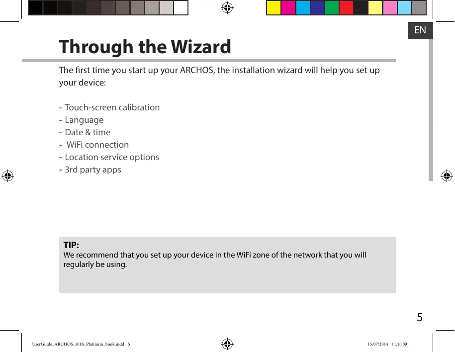 Through the Wizard The first time you start up your ARCHOS, the installation wizard will help you set up your device: -- Touch-screen calibration -- Language -- Date & time -- WiFi connection -- Location service options -- 3rd party apps TIP: We recommend that you set up your device in the WiFi zone of the network that you will regularly be using.