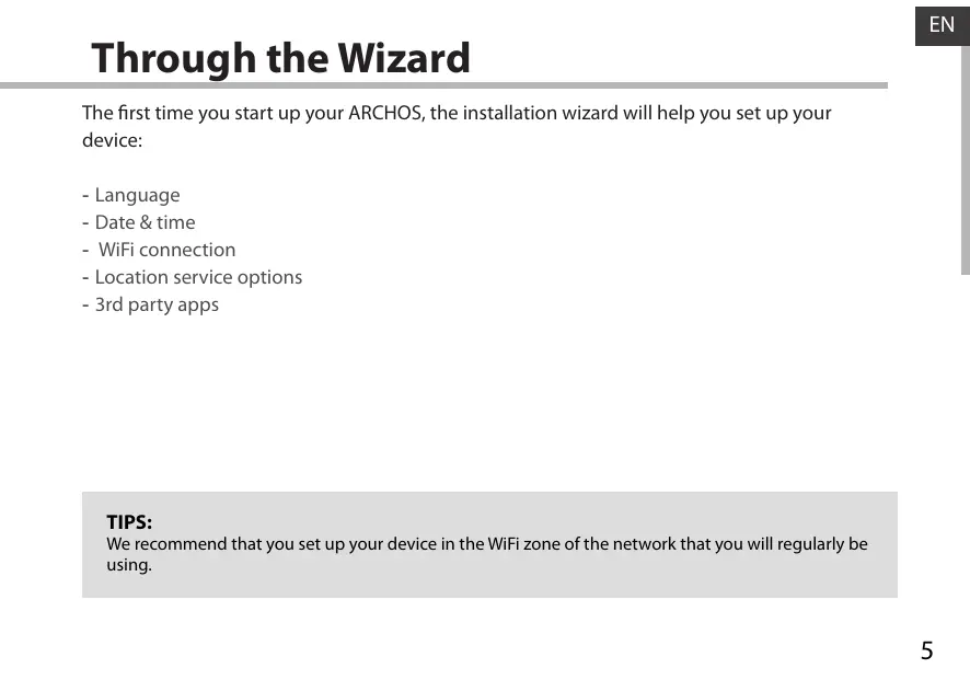 The first time you start up your ARCHOS, the installation wizard will help you set up your device: -- Language -- Date & time -- WiFi connection -- Location service options -- 3rd party apps TIPS: We recommend that you set up your device in the WiFi zone of the network that you will regularly be using.