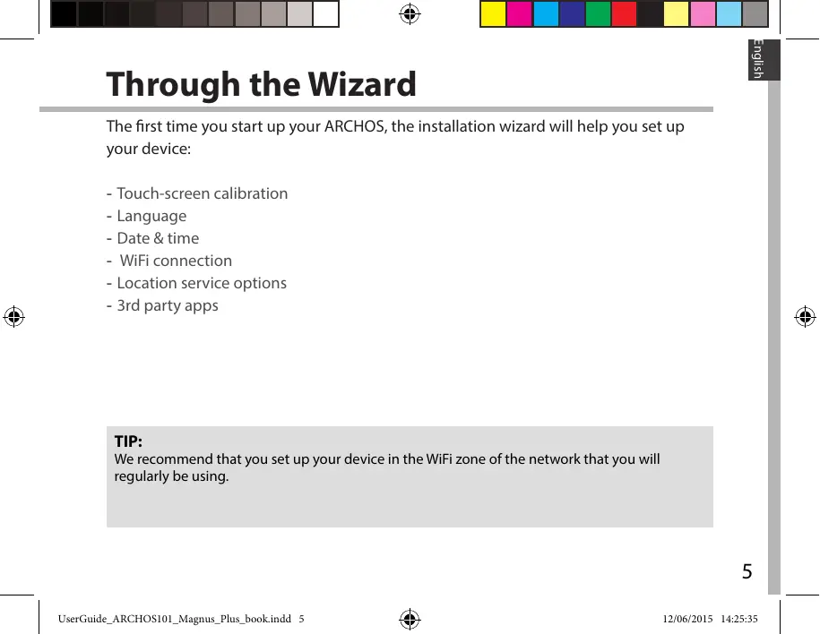 UserGuide_ARCHOS101_Magnus_Plus_book.indd 4 12/06/2015 14:25:35 English Through the Wizard The first time you start up your ARCHOS, the installation wizard will help you set up your device: -- Touch-screen calibration -- Language -- Date & time -- WiFi connection -- Location service options -- 3rd party apps TIP: We recommend that you set up your device in the WiFi zone of the network that you will regularly be using.