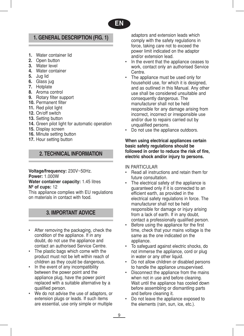 The appliance must be used only for household use, for which it is designed, and as outlined in this Manual. Any other use shall be considered unsuitable and consequently dangerous. The manufacturer shall not be held responsible for any damage arising from incorrect, incorrect or irresponsible use and/or due to repairs carried out by unqualified persons.