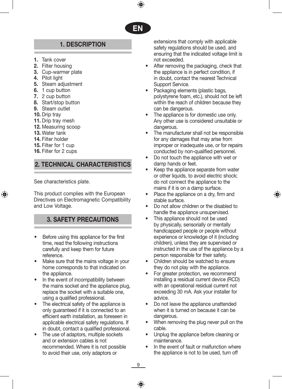 extensions that comply with applicable safety regulations should be used, and ensuring that the indicated voltage limit is not exceeded. After removing the packaging, check that the appliance is in perfect condition, if in doubt, contact the nearest Technical Support Service. Packaging elements (plastic bags, polystyrene foam, etc.), should not be left within the reach of children because they can be dangerous. The appliance is for domestic use only. Any other use is considered unsuitable or dangerous. The manufacturer shall not be responsible for any damages that may arise from improper or inadequate use, or for repairs conducted by non-qualified personnel. Do not touch the appliance with wet or damp hands or feet. Keep the appliance separate from water or other liquids, to avoid electric shock; do not connect the appliance to the mains if it is on a damp surface. Place the appliance on a dry, firm and stable surface. Do not allow children or the disabled to handle the appliance unsupervised. This appliance should not be used by physically, sensorially or mentally handicapped people or people without experience or knowledge of it (including children), unless they are supervised or instructed in the use of the appliance by a person responsible for their safety. Children should be watched to ensure they do not play with the appliance. For greater protection, we recommend installing a residual current device (RCD) with an operational residual current not exceeding 30 mA. Ask your installer for advice. Do not leave the appliance unattended when it is turned on because it can be dangerous. When removing the plug never pull on the cable. Unplug the appliance before cleaning or maintenance. In the event of fault or malfunction where the appliance is not to be used, turn off