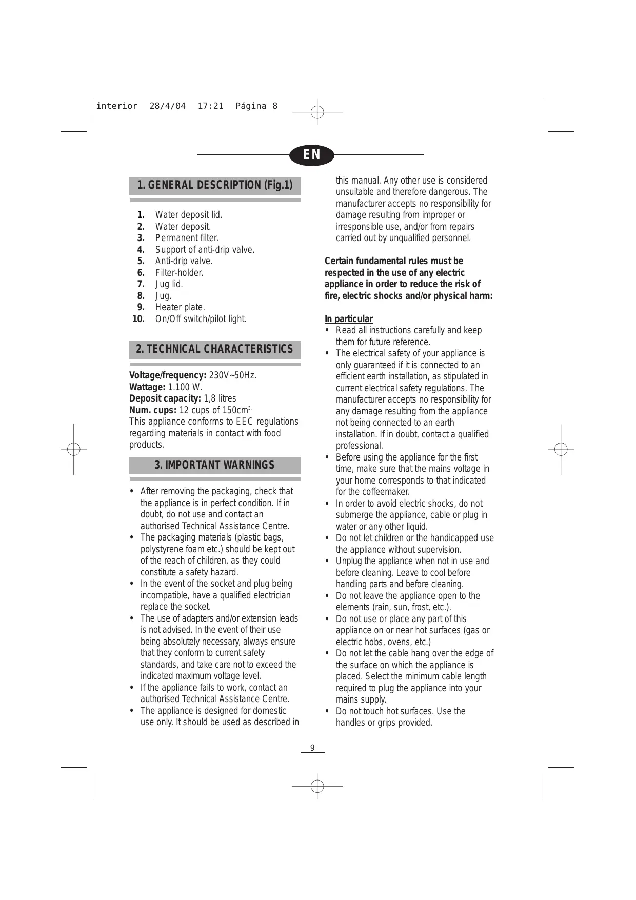 this manual. Any other use is considered unsuitable and therefore dangerous. The manufacturer accepts no responsibility for damage resulting from improper or irresponsible use, and/or from repairs carried out by unqualified personnel. Water deposit lid. Water deposit. Permanent filter. Support of anti-drip valve. Anti-drip valve. Filter-holder. Jug lid. Jug. Heater plate. On/Off switch/pilot light. Certain fundamental rules must be respected in the use of any electric appliance in order to reduce the risk of fire, electric shocks and/or physical harm: In particular