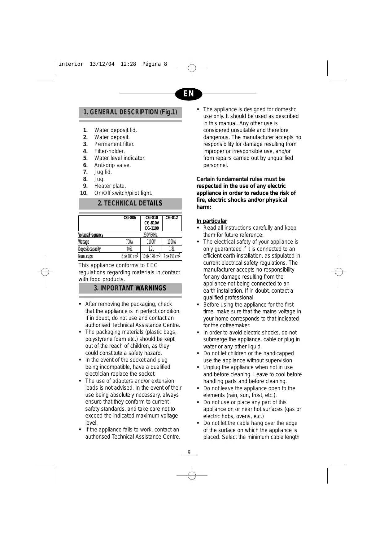 - The appliance is designed for domestic use only. It should be used as described in this manual. Any other use is considered unsuitable and therefore dangerous. The manufacturer accepts no responsibility for damage resulting from improper or irresponsible use, and/or from repairs carried out by unqualified personnel. Water deposit lid. Water deposit. Permanent filter. Filter-holder. Water level indicator. Anti-drip valve. Jug lid. Jug. Heater plate. On/Off switch/pilot light. Certain fundamental rules must be respected in the use of any electric appliance in order to reduce the risk of fire, electric shocks and/or physical harm: Voltage/Frequency Wattage Deposit capacity Num. cups CG-810 CG-810V CG-1100 CG-812 In particular