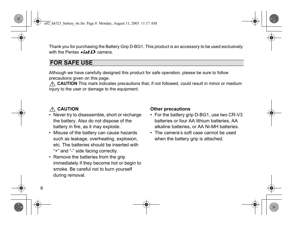 e02_kb321_battery_6e.fm Page 8 Monday, August 11, 2003 11:17 AM Thank you for purchasing the Battery Grip D-BG1. This product is an accessory to be used exclusively with the Pentax w camera.