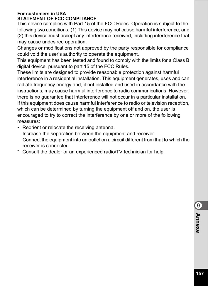 Déclaration de conformité Conformément à 47CFR, Parties 2 et 15 pour ordinateurs personnels et périphériques de classe B We: PENTAX Imaging Company A Division of PENTAX of America, Inc. Located at: 600 12 th Street, Suite 300 Golden, Colorado 80401 U.S.A. Phone: 303-799-8000 FAX: 303-790-1131 Declare under sole responsibility that the product identified herein complies with 47CFR Parts 2 and 15 of the FCC rules as a Class B digital device. Each product marketed is identical to the representative unit tested and found to be compliant with the standards. Records maintained continue to reflect the equipment being produced can be expected to be within the variation accepted, due to quantity production and testing on the statistical basis as required by 47CFR §2.909. Operation is subject to the following two conditions: (1) This device may not cause harmful interference, and (2) This device must accept any interference received, including interference that may cause undesired operation. The above named party is responsible for ensuring that the equipment complies with the standards of 47CFR §15.101 to §15.109. Product Name: PENTAX Digital Still Camera Model Number: Optio E30 Contact person: Customer Service Manager Annexe
