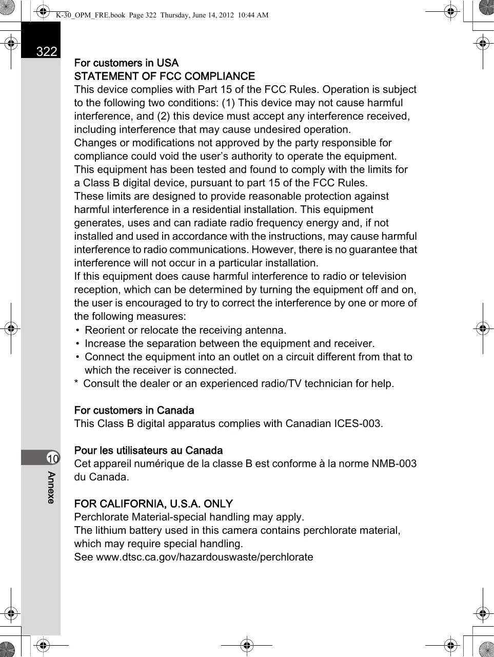 Perchlorate Material-special handling may apply. The lithium battery used in this camera contains perchlorate material, which may require special handling. See www.dtsc.ca.gov/hazardouswaste/perchlorate K-30_OPM_FRE.book Page 323 Thursday, June 14, 2012 10:44 AM Declaration of Conformity