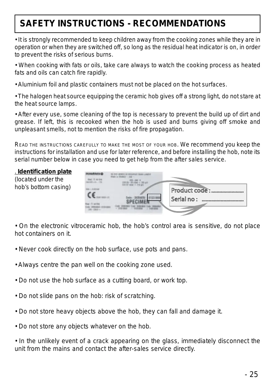 READ THE INSTRUCTIONS CAREFULLY TO MAKE THE MOST OF YOUR HOB. We recommend you keep the instructions for installation and use for later reference, and before installing the hob, note its serial number below in case you need to get help from the after sales service.