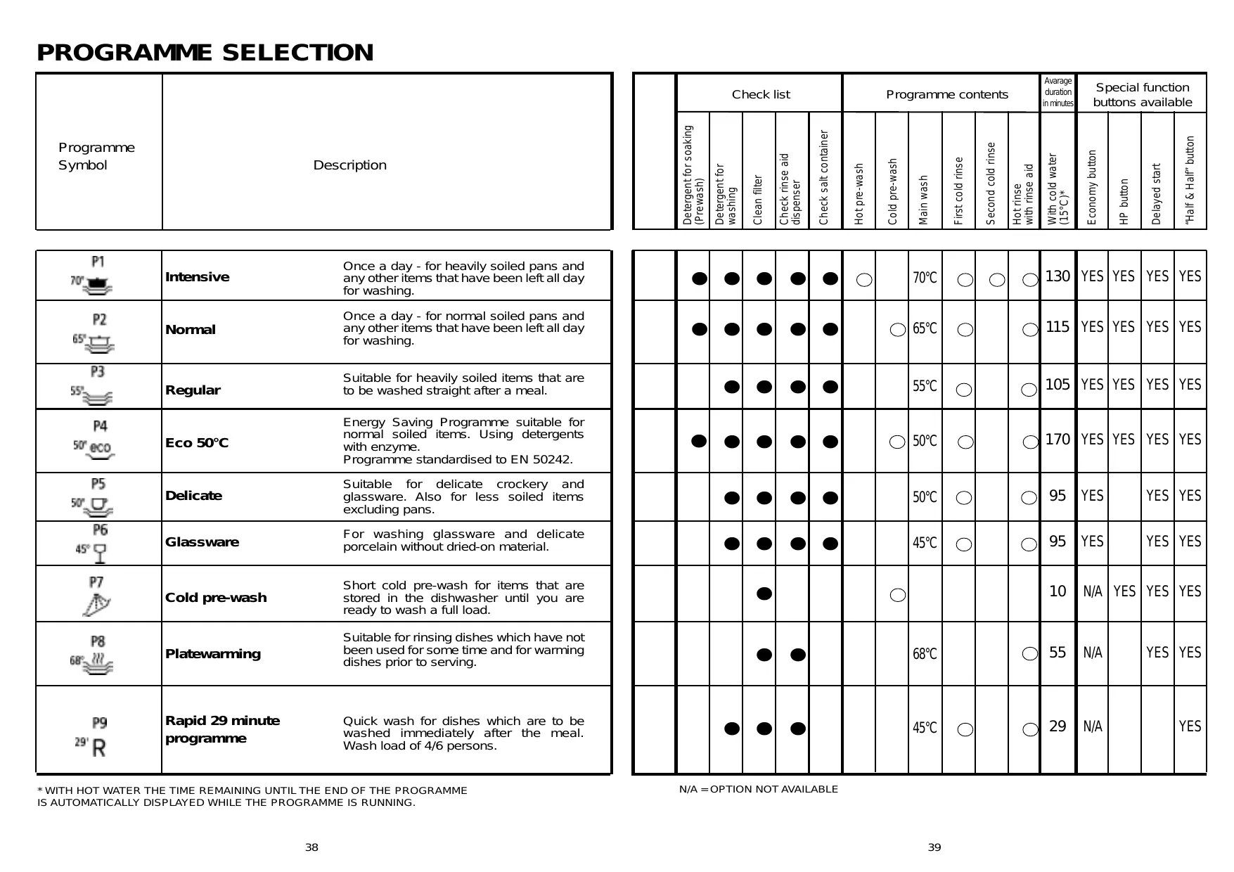 N/A YES Operating the programmes and special functions Use in conjunction with programme guide Setting a programme Open the door press the button; the last programme selected will appear on the display. To set a new programme, press the Programme Selection Button "P". When the required programme is shown in the display, press the Economy button Delay Start programme button The "E" button reduces the temperature of the water during the last rinse, provides an energy saving of more than 20% and shortens the cycle. Recommended for evening washes when the dishes are not required perfectly dry, straight away. To set the delay start programme press the button. Interrupting a programme It is not recommended that the door be opened while a programme is running, and especially not during the main wash phase and final drying. However, the appliance will stop automatically when the door is opened. At this point the various wash options can be programmed or cancelled. The current programme can also be cancelled. If, the door is opened during a programme, the symbol for that programme will flash in the display and the machine stops. button. The time of the selected programme (in hours and minutes) will start to flash in the display. Close the door and after an audible signal has sounded (if it has not been deactivated) the programme will start automatically. Please Note: If you open the door during the drying cycle an audible audio signal advises you that the drying cycle has not yet completed. HALF & HALF Button To ensure that your dishwasher meets all your requirements, the “HALF & HALF” option button allows you to select: