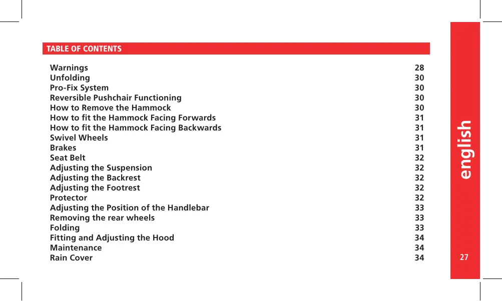 Warnings Unfolding Pro-Fix System Reversible Pushchair Functioning How to Remove the Hammock How to fit the Hammock Facing Forwards How to fit the Hammock Facing Backwards Swivel Wheels Brakes Seat Belt Adjusting the Suspension Adjusting the Backrest Adjusting the Footrest Protector Adjusting the Position of the Handlebar Removing the rear wheels Folding Fitting and Adjusting the Hood Maintenance Rain Cover