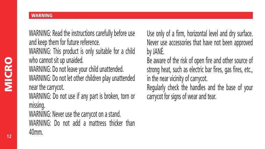 Never use accessories that have not been approved by JANÉ. Be aware of the risk of open fire and other source of strong heat, such as electric bar fires, gas fires, etc., in the near vicinity of carrycot. Regularly check the handles and the base of your carrycot for signs of wear and tear.