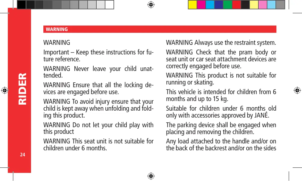 WARNING Important – Keep these instructions for future reference. WARNING Never leave your child unattended. WARNING Ensure that all the locking devices are engaged before use. WARNING To avoid injury ensure that your child is kept away when unfolding and folding this product. WARNING Do not let your child play with this product WARNING This seat unit is not suitable for children under 6 months. WARNING Always use the restraint system. WARNING Check that the pram body or seat unit or car seat attachment devices are correctly engaged before use. WARNING This product is not suitable for running or skating. This vehicle is intended for children from 6 months and up to 15 kg. Suitable for children under 6 months old only with accessories approved by JANÉ. The parking device shall be engaged when placing and removing the children. Any load attached to the handle and/or on the back of the backrest and/or on the sides Only replacement parts supplied or recommended by JANÉ shall be used. The maximum amount carried in the basket must never exceed the weight indicated on the basket (4 kg). english of the vehicle will affect the stability of the vehicle. This vehicle has been designed to be used by one child. Do not use it with more children at the same time. Never use accessories that have not been approved by JANÉ, S.A. For car seats used in conjunction with a chassis, this vehicle does not replace a cot or a bed. Should your child need to sleep, then it should be placed in a suitable pram body, cot or bed.