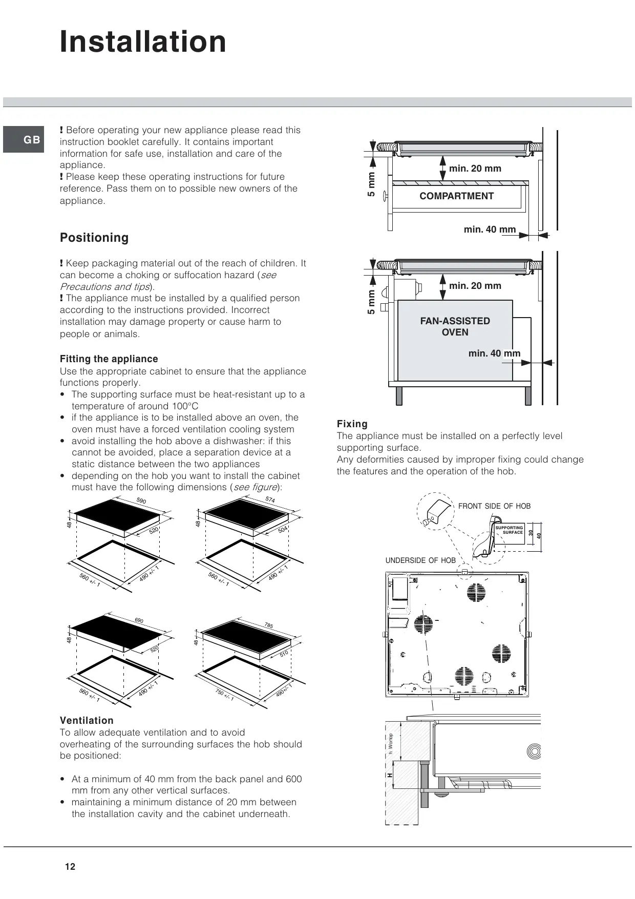 SUPPORTING SURFACE To allow adequate ventilation and to avoid overheating of the surrounding surfaces the hob should be positioned: At a minimum of 40 mm from the back panel and 600 mm from any other vertical surfaces. maintaining a minimum distance of 20 mm between the installation cavity and the cabinet underneath.
