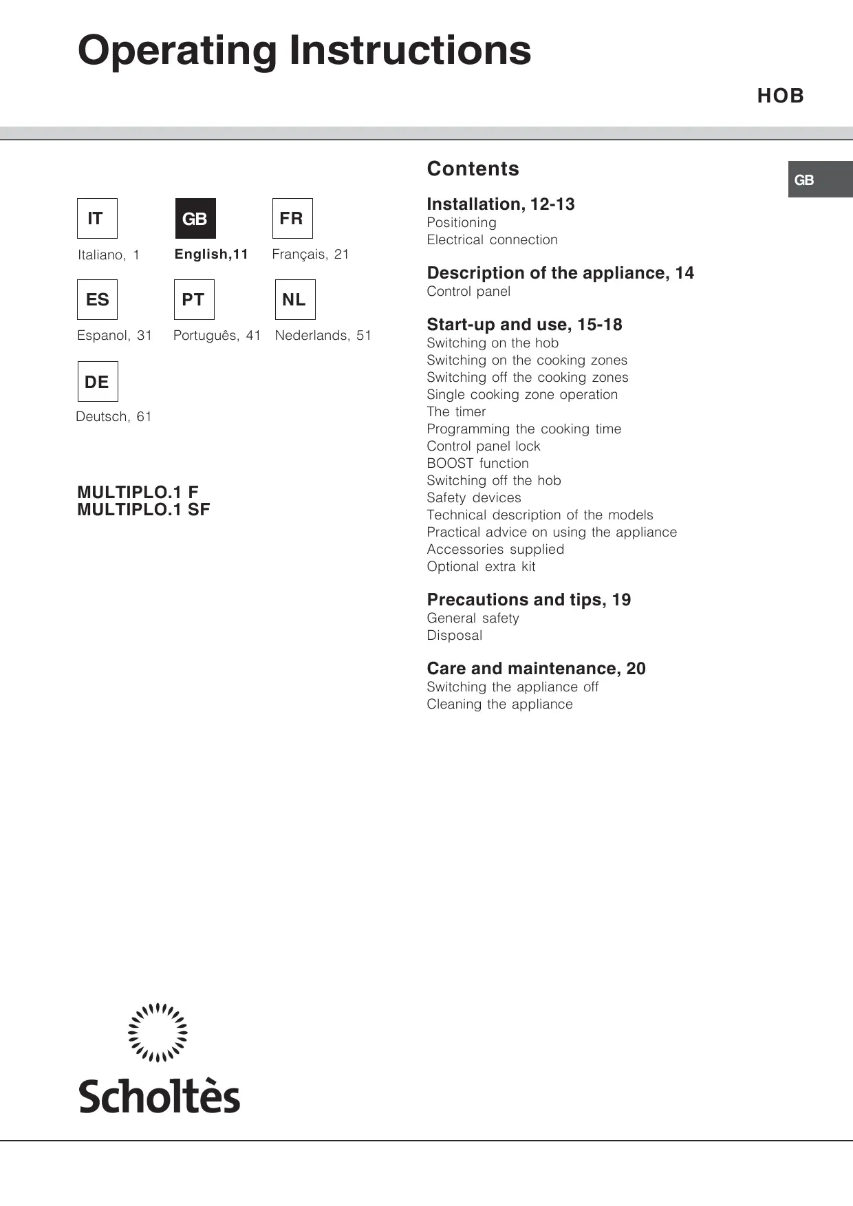 Download the instructions for your Hob in PDF format for free! Find your manual MULTIPLO.1 F - SCHOLTES and take your electronic device back in hand. On this page are published all the documents necessary for the use of your device. MULTIPLO.1 F by SCHOLTES.