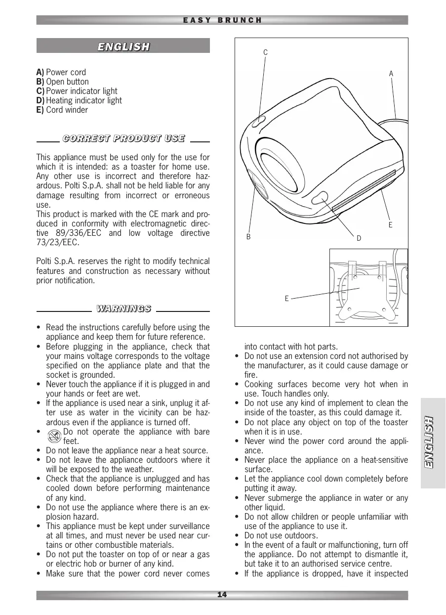This appliance must be used only for the use for which it is intended: as a toaster for home use. Any other use is incorrect and therefore hazardous. Polti S.p.A. shall not be held liable for any damage resulting from incorrect or erroneous use. This product is marked with the CE mark and produced in conformity with electromagnetic directive 89/336/EEC and low voltage directive 73/23/EEC.