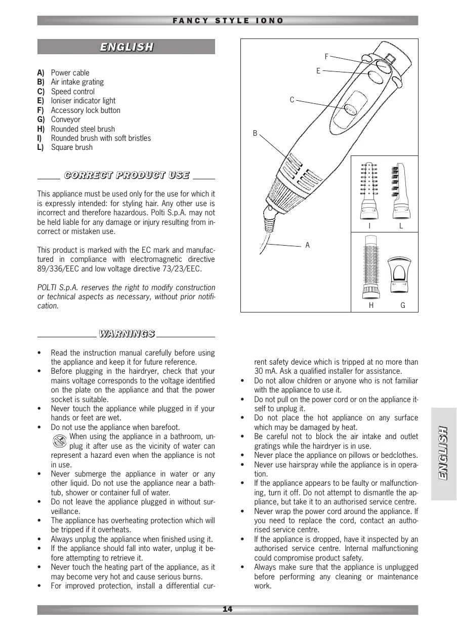 IMPORTANT: never block up the grating at the air intake opening, or the appliance may overheat. It this occurs, a safety device will be triggered which automatically shuts down the appliance. The appliance will shut down automatically. You must turn it off (put the switch in the OFF position) and unplug it. Remove all obstacles from the grating and wait ten minutes before attempting to use the appliance again. If the appliance does not start working again, contact an authorised Polti service centre. Application Snap the accessory you wish to use onto the body of the appliance, checking that it is connected up properly. When you wish to replace the accessory, press button (F) to release the accessory from the body of the appliance. Air conveyor (G) The perfect accessory for drying the hair quickly with abundant air. The air conveyor opening allows you to dry particular locks of hair with extra care and create special effects. This may be done with hot or cold air. To replace accessories, simply press button (F) and separate the hair styling appliance from the accessory assembled on it. AFTER USE When finished using the appliance, do not leave it plugged in. Unplug it and let it cool down before putting it away in a safe, dry place out of the reach of children. Never wind the power cord around the appliance. Treat the cord carefully. Do not pull on it, bend it sharply Brushes supplied The appliance is supplied with three brush accessories. The rounded brush with soft bristles is recommended