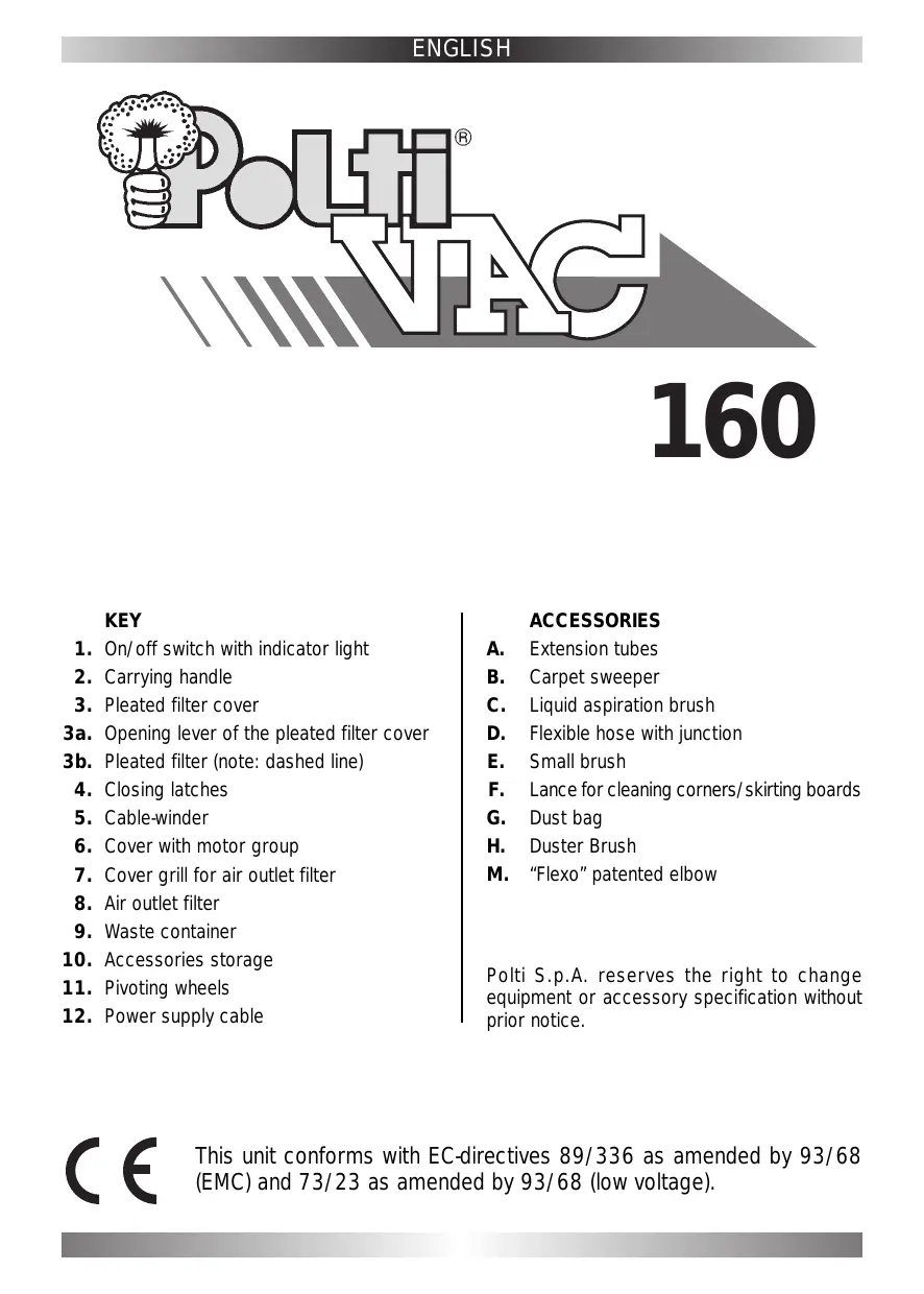 ACCESSORIES Extension tubes Carpet sweeper Liquid aspiration brush Flexible hose with junction Small brush Lance for cleaning corners/skirting boards Dust bag Duster Brush “Flexo” patented elbow Polti S.p.A. reserves the right to change equipment or accessory specification without prior notice. This unit conforms with EC-directives 89/336 as amended by 93/68 (EMC) and 73/23 as amended by 93/68 (low voltage). ENGLISH PRECAUTIONS Attention! Do not use the appliance without reading the instructions.