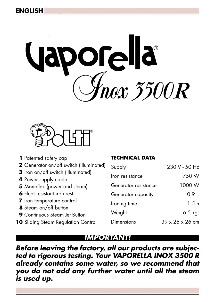 Download the instructions for your Steam iron in PDF format for free! Find your manual VAPORELLA INOX 3500 R - POLTI and take your electronic device back in hand. On this page are published all the documents necessary for the use of your device. VAPORELLA INOX 3500 R by POLTI.