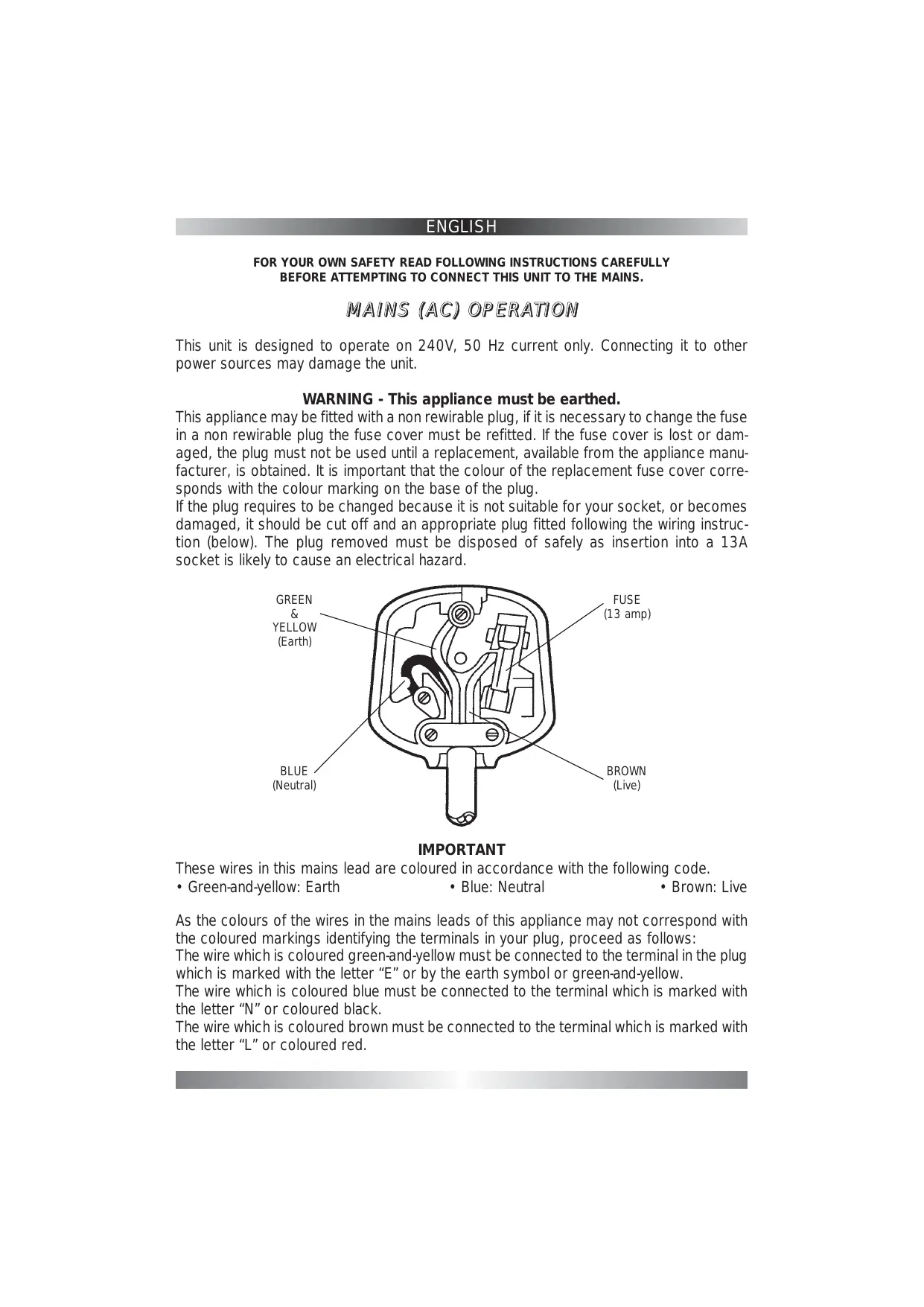 - Brown: Live As the colours of the wires in the mains leads of this appliance may not correspond with the coloured markings identifying the terminals in your plug, proceed as follows: The wire which is coloured green-and-yellow must be connected to the terminal in the plug which is marked with the letter “E” or by the earth symbol or green-and-yellow. The wire which is coloured blue must be connected to the terminal which is marked with the letter “N” or coloured black. The wire which is coloured brown must be connected to the terminal which is marked with the letter “L” or coloured red. ENGLISH