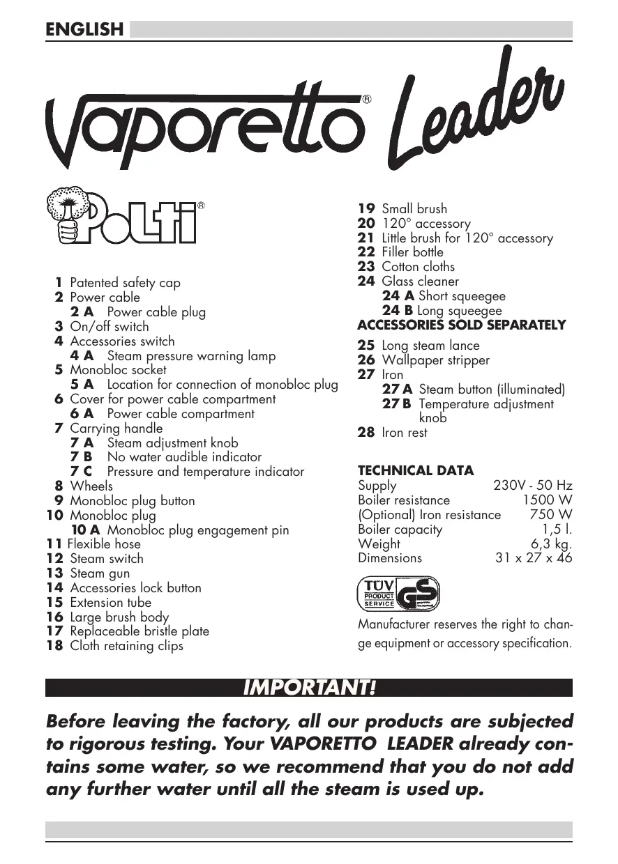 Download the instructions for your Steam cleaner in PDF format for free! Find your manual VAPORETTO LEADER - POLTI and take your electronic device back in hand. On this page are published all the documents necessary for the use of your device. VAPORETTO LEADER by POLTI.