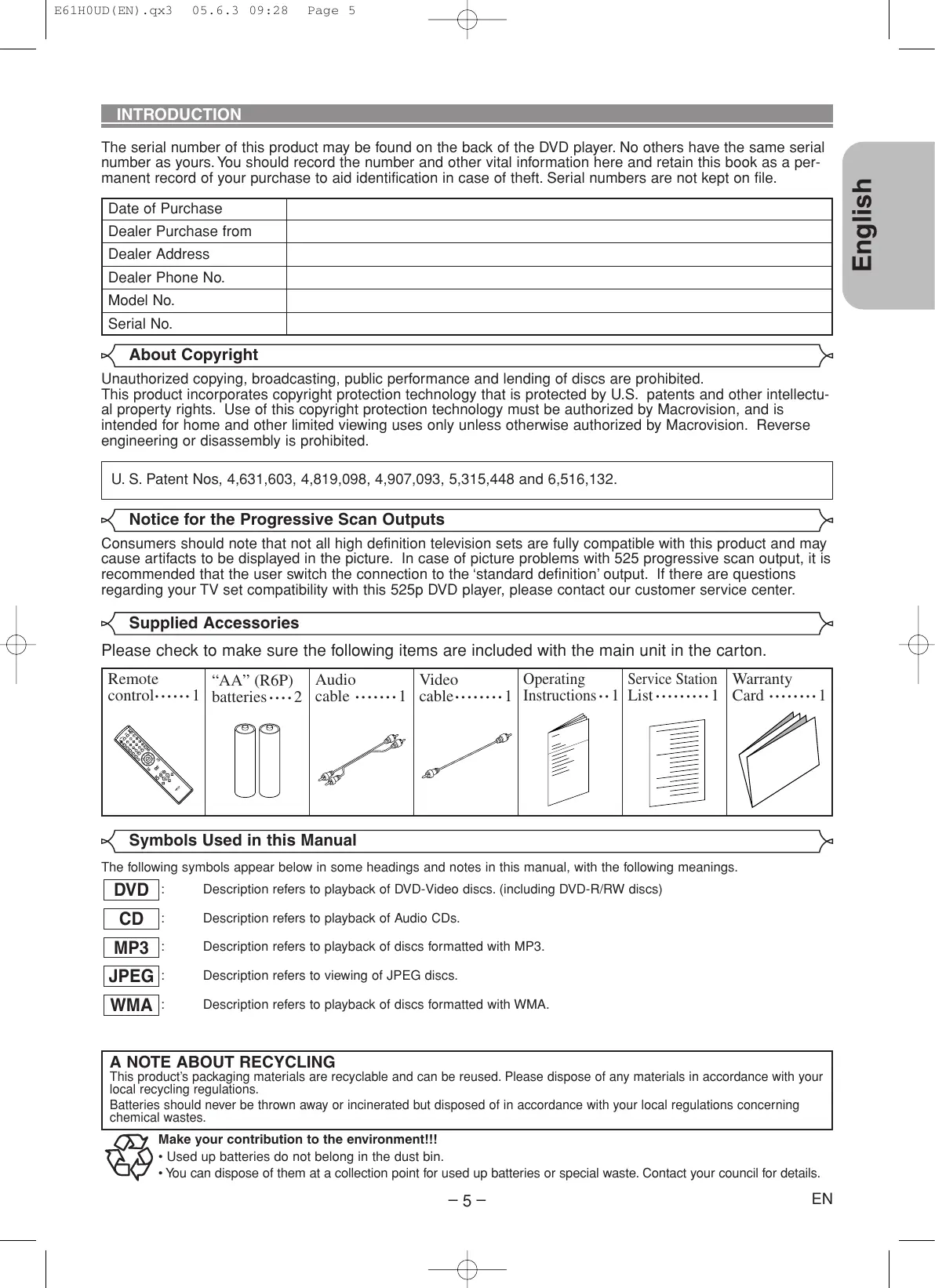 The serial number of this product may be found on the back of the DVD player. No others have the same serial number as yours. You should record the number and other vital information here and retain this book as a permanent record of your purchase to aid identification in case of theft. Serial numbers are not kept on file. Date of Purchase Dealer Purchase from Dealer Address Dealer Phone No. Model No. Serial No. About Copyright Unauthorized copying, broadcasting, public performance and lending of discs are prohibited. This product incorporates copyright protection technology that is protected by U.S. patents and other intellectual property rights. Use of this copyright protection technology must be authorized by Macrovision, and is intended for home and other limited viewing uses only unless otherwise authorized by Macrovision. Reverse engineering or disassembly is prohibited. U. S. Patent Nos, 4,631,603, 4,819,098, 4,907,093, 5,315,448 and 6,516,132. Notice for the Progressive Scan Outputs Consumers should note that not all high definition television sets are fully compatible with this product and may cause artifacts to be displayed in the picture. In case of picture problems with 525 progressive scan output, it is recommended that the user switch the connection to the ‘standard definition’ output. If there are questions regarding your TV set compatibility with this 525p DVD player, please contact our customer service center. Supplied Accessories Please check to make sure the following items are included with the main unit in the carton.