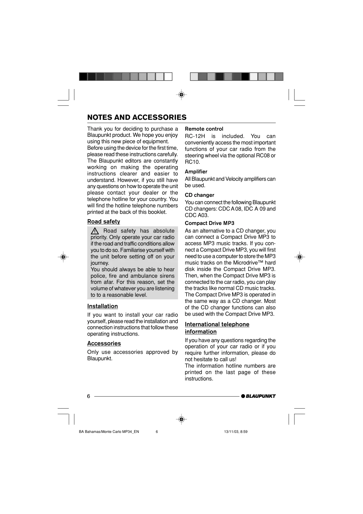Thank you for deciding to purchase a Blaupunkt product. We hope you enjoy using this new piece of equipment. Before using the device for the first time, please read these instructions carefully. The Blaupunkt editors are constantly working on making the operating instructions clearer and easier to understand. However, if you still have any questions on how to operate the unit please contact your dealer or the telephone hotline for your country. You will find the hotline telephone numbers printed at the back of this booklet. Road safety Road safety has absolute priority. Only operate your car radio if the road and traffic conditions allow you to do so. Familiarise yourself with the unit before setting off on your journey. You should always be able to hear police, fire and ambulance sirens from afar. For this reason, set the volume of whatever you are listening to to a reasonable level. Installation If you want to install your car radio yourself, please read the installation and connection instructions that follow these operating instructions. Accessories Only use accessories approved by Blaupunkt. Remote control RC-12H is included. You can conveniently access the most important functions of your car radio from the steering wheel via the optional RC08 or RC10. Amplifier All Blaupunkt and Velocity amplifiers can be used. CD changer You can connect the following Blaupunkt CD changers: CDC A 08, IDC A 09 and CDC A03. Compact Drive MP3 As an alternative to a CD changer, you can connect a Compact Drive MP3 to access MP3 music tracks. If you connect a Compact Drive MP3, you will first need to use a computer to store the MP3 music tracks on the Microdrive™ hard disk inside the Compact Drive MP3. Then, when the Compact Drive MP3 is connected to the car radio, you can play the tracks like normal CD music tracks. The Compact Drive MP3 is operated in the same way as a CD changer. Most of the CD changer functions can also be used with the Compact Drive MP3. International telephone information If you have any questions regarding the operation of your car radio or if you require further information, please do not hesitate to call us! The information hotline numbers are printed on the last page of these instructions.