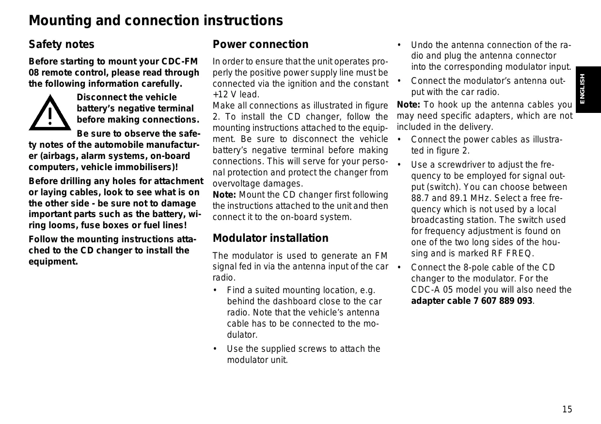 88.7 and 89.1 MHz. Select a free frequency which is not used by a local broadcasting station. The switch used for frequency adjustment is found on one of the two long sides of the housing and is marked RF FREQ. Connect the 8-pole cable of the CD changer to the modulator. For the CDC-A 05 model you will also need the adapter cable 7 607 889 093.