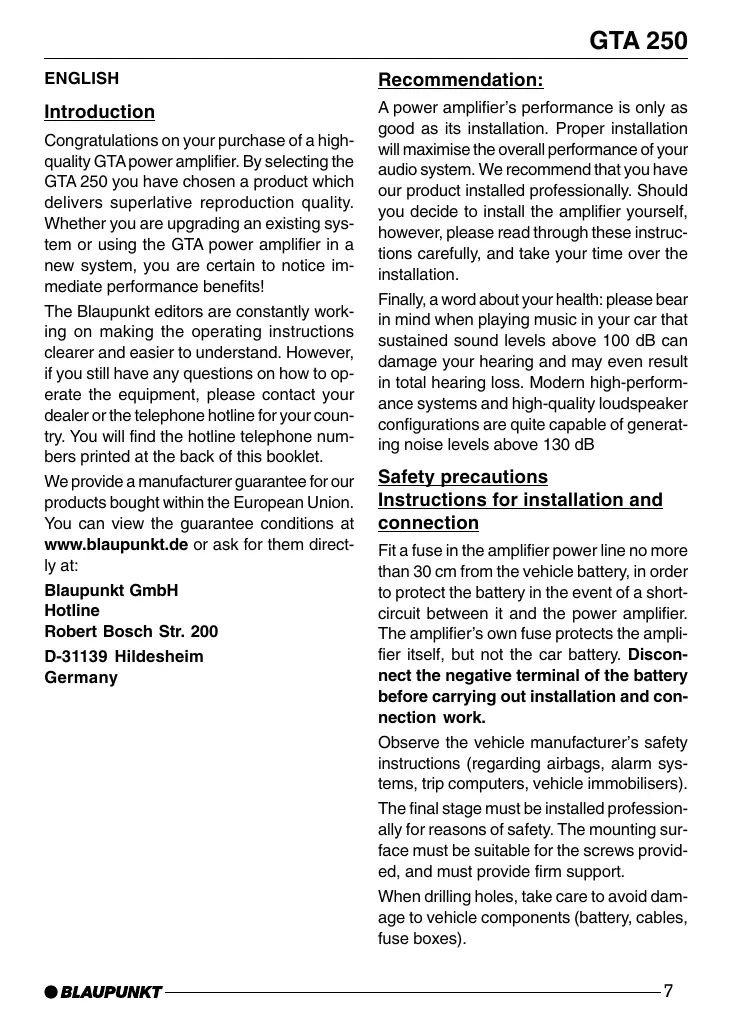 GTA 250 you have chosen a product which delivers superlative reproduction quality. Whether you are upgrading an existing system or using the GTA power amplifier in a new system, you are certain to notice immediate performance benefits! The Blaupunkt editors are constantly working on making the operating instructions clearer and easier to understand. However, if you still have any questions on how to operate the equipment, please contact your dealer or the telephone hotline for your country. You will find the hotline telephone numbers printed at the back of this booklet. We provide a manufacturer guarantee for our products bought within the European Union. You can view the guarantee conditions at www.blaupunkt.de or ask for them directly at: Blaupunkt GmbH Hotline Robert Bosch Str. 200 D-31139 Hildesheim Germany