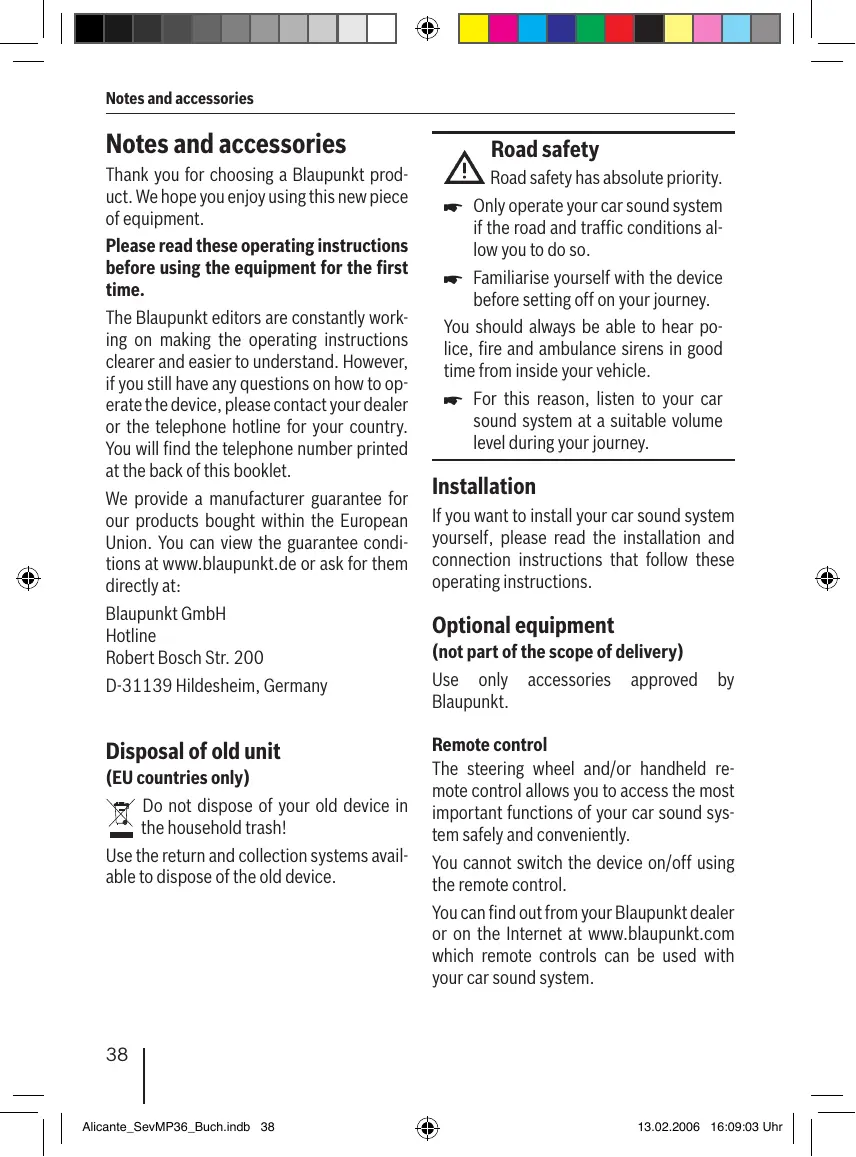 Thank you for choosing a Blaupunkt product. We hope you enjoy using this new piece of equipment. Please read these operating instructions before using the equipment for the first time. The Blaupunkt editors are constantly working on making the operating instructions clearer and easier to understand. However, if you still have any questions on how to operate the device, please contact your dealer or the telephone hotline for your country. You will find the telephone number printed at the back of this booklet. We provide a manufacturer guarantee for our products bought within the European Union. You can view the guarantee conditions at www.blaupunkt.de or ask for them directly at: Blaupunkt GmbH Hotline Robert Bosch Str. 200 D-31139 Hildesheim, Germany
