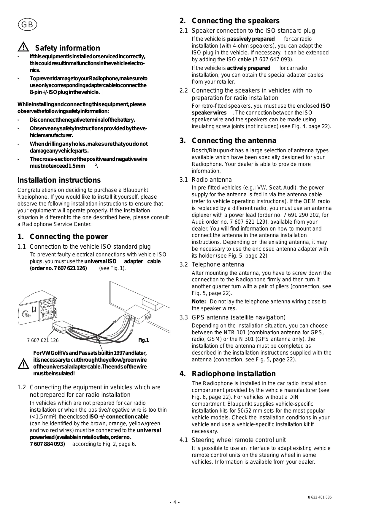 Installation instructions In pre-fitted vehicles (e.g.: VW, Seat, Audi), the power supply for the antenna is fed in via the antenna cable (refer to vehicle operating instructions). If the OEM radio is replaced by a different radio, you must use an antenna diplexer with a power lead (order no. 7 691 290 202, for Audi: order no. 7 607 621 129), available from your dealer. You will find information on how to mount and connect the antenna in the antenna installation instructions. Depending on the existing antenna, it may be necessary to use the enclosed antenna adapter with its holder (see Fig. 5, page 22). Congratulations on deciding to purchase a Blaupunkt Radiophone. If you would like to install it yourself, please observe the following installation instructions to ensure that your equipment will operate properly. If the installation situation is different to the one described here, please consult a Radiophone Service Center.