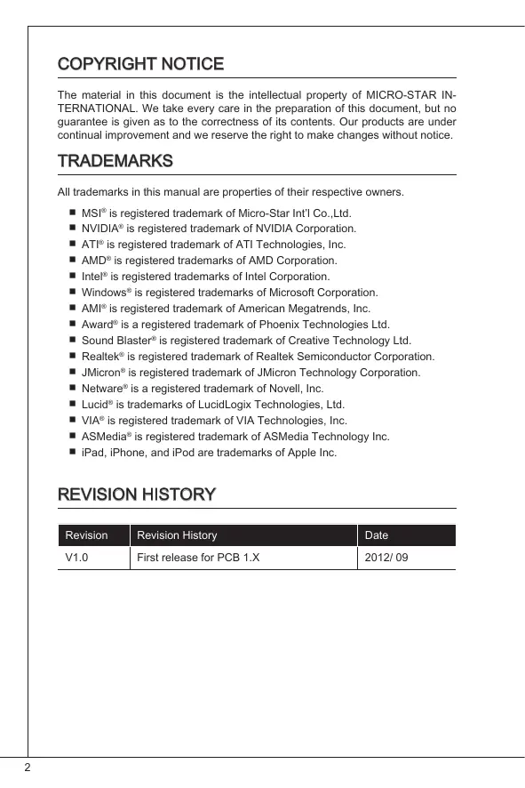The material in this document is the intellectual property of MICRO-STAR INTERNATIONAL. We take every care in the preparation of this document, but no guarantee is given as to the correctness of its contents. Our products are under continual improvement and we reserve the right to make changes without notice.
