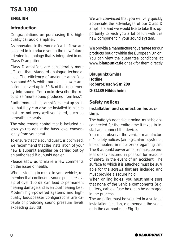 To ensure that the sound quality is optimised, we recommend that the installation of your new Blaupunkt amplifier be carried out by an authorised Blaupunkt dealer.