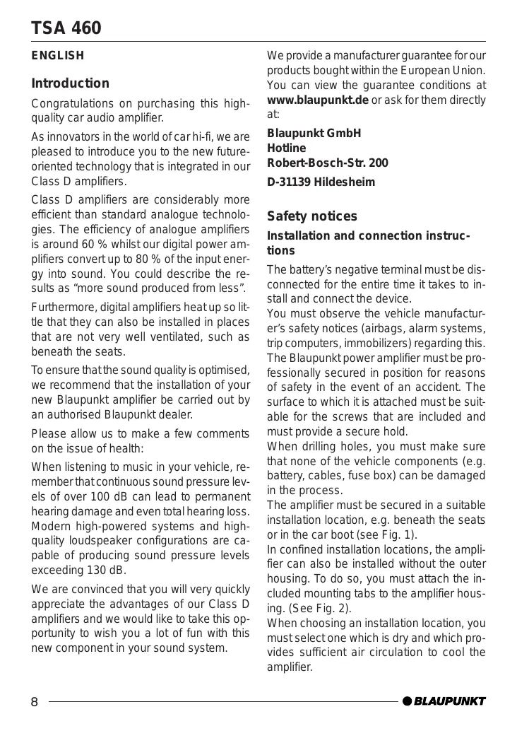 We provide a manufacturer guarantee for our products bought within the European Union. You can view the guarantee conditions at www.blaupunkt.de or ask for them directly at: Blaupunkt GmbH Hotline Robert-Bosch-Str. 200 D-31139 Hildesheim Safety notices Installation and connection instructions The battery’s negative terminal must be disconnected for the entire time it takes to install and connect the device. You must observe the vehicle manufacturer’s safety notices (airbags, alarm systems, trip computers, immobilizers) regarding this. The Blaupunkt power amplifier must be professionally secured in position for reasons of safety in the event of an accident. The surface to which it is attached must be suitable for the screws that are included and must provide a secure hold. When drilling holes, you must make sure that none of the vehicle components (e.g. battery, cables, fuse box) can be damaged in the process. The amplifier must be secured in a suitable installation location, e.g. beneath the seats or in the car boot (see Fig. 1). In confined installation locations, the amplifier can also be installed without the outer housing. To do so, you must attach the included mounting tabs to the amplifier housing. (See Fig. 2). When choosing an installation location, you must select one which is dry and which provides sufficient air circulation to cool the amplifier. TSA 460 Use cable grommets to protect cables against sharp-edged holes. Use loudspeakers with an impedance of 2-4 Ω. Observe the maximum load rating (music power rating). Use loudspeaker connecting cables up to