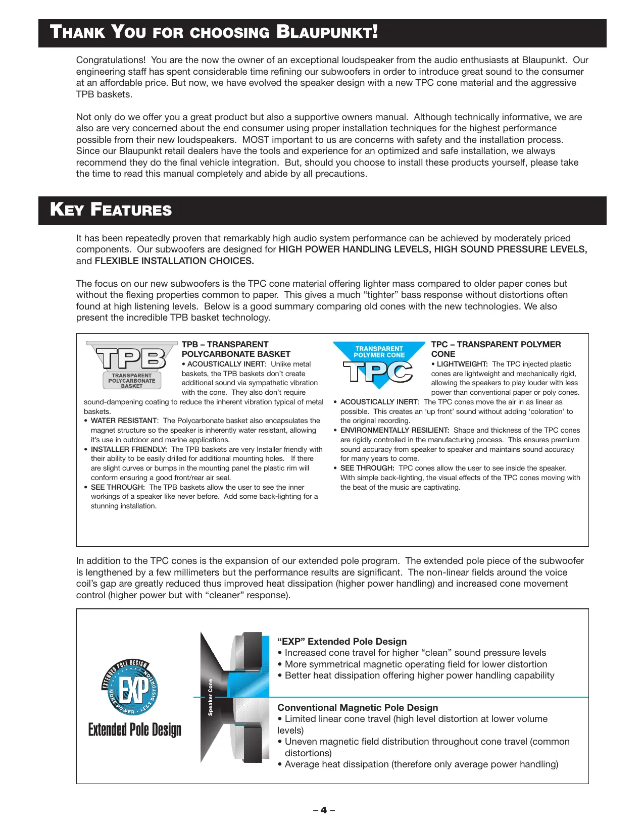 Congratulations! You are the now the owner of an exceptional loudspeaker from the audio enthusiasts at Blaupunkt. Our engineering staff has spent considerable time refining our subwoofoers in order to introduce great sound to the consumer at an affordable price. But now, we have evolved the speaker design with a new TPC cone material and the aggressive TPB baskets.