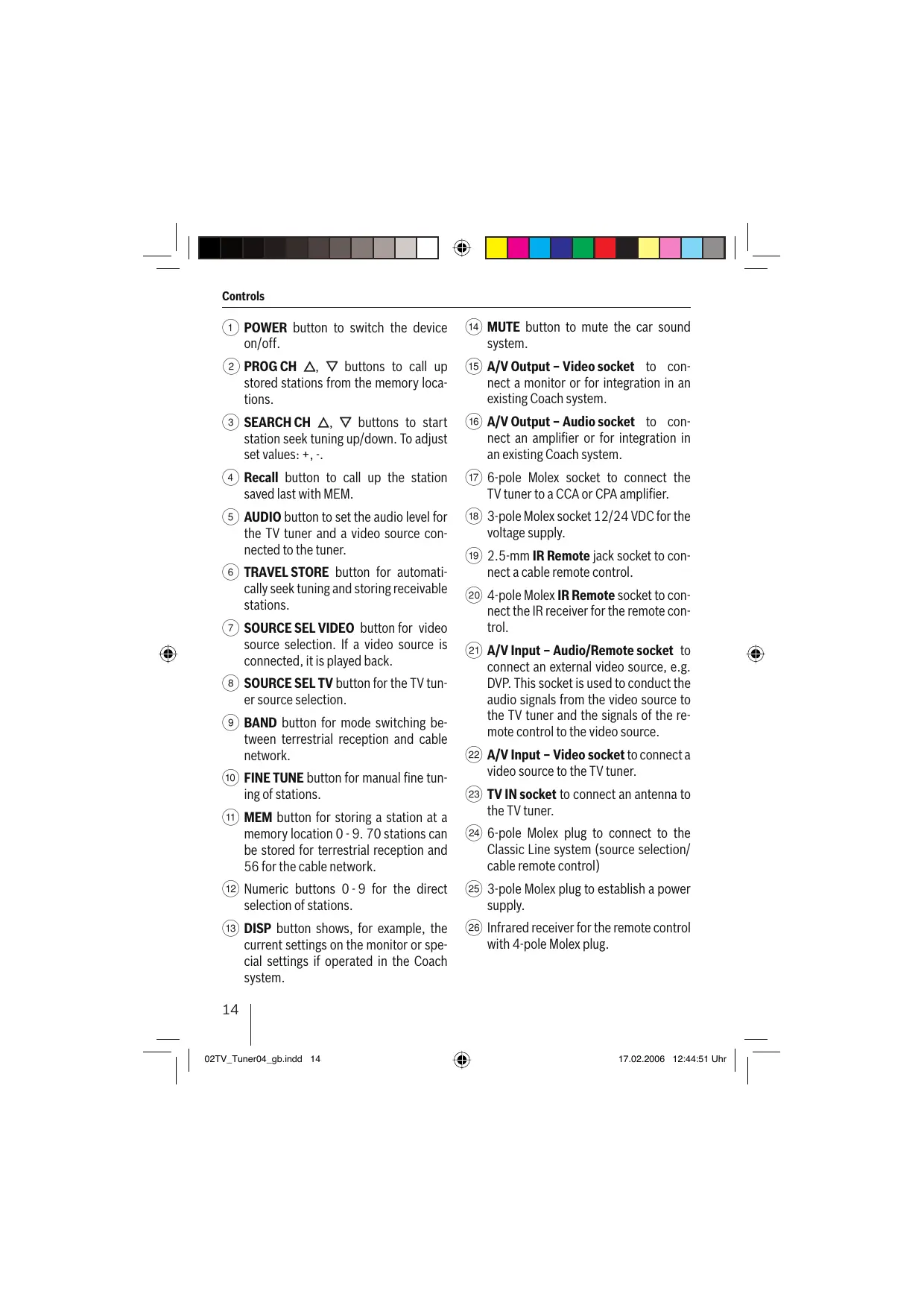 11 MEM button for storing a station at a memory location 0-9. 70 stations can be stored for terrestrial reception and 56 for the cable network.