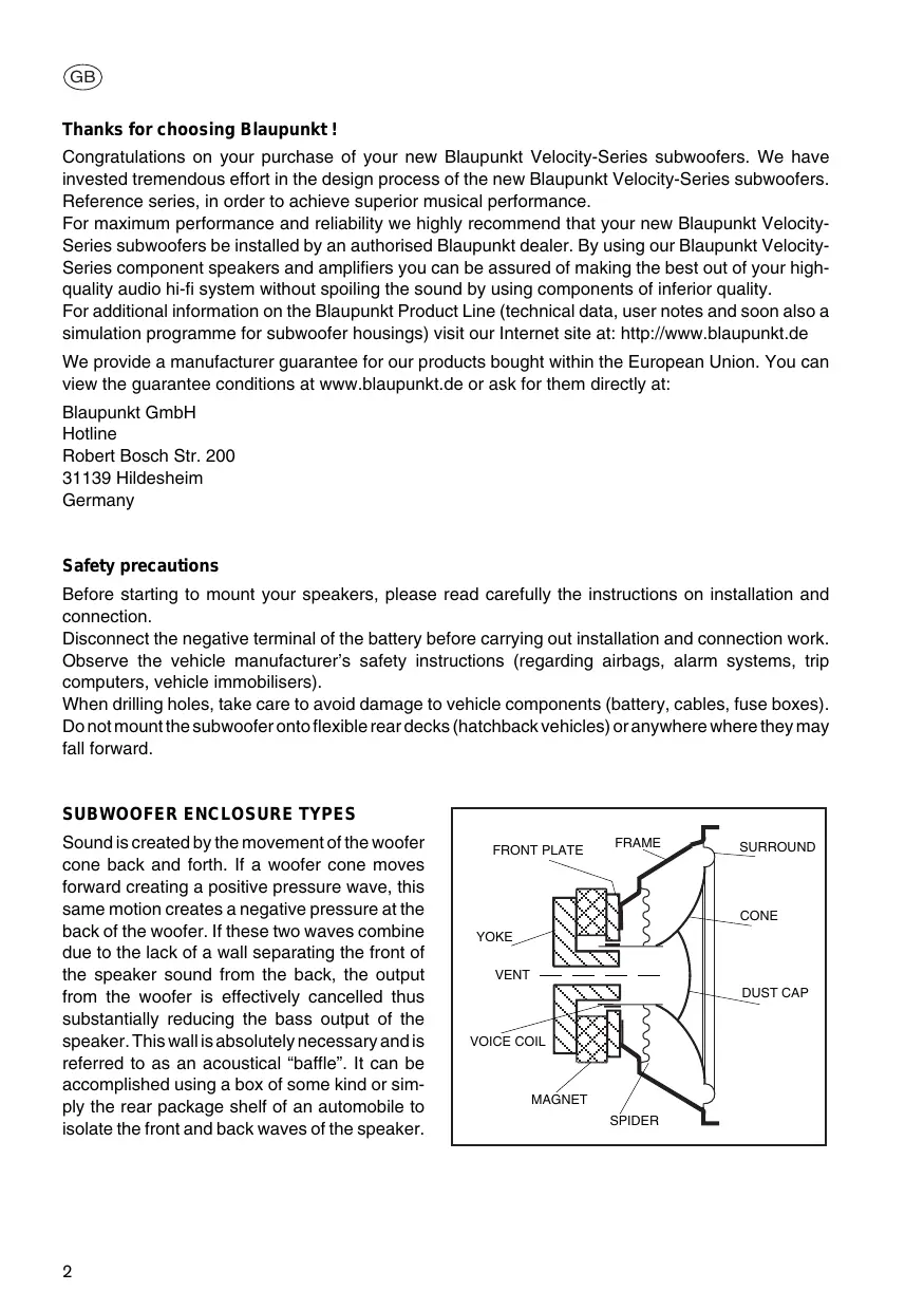 Congratulations on your purchase of your new Blaupunkt Velocity-Series subwoofoers. We have invested tremendous effort in the design process of the new Blaupunkt Velocity-Series subwoofoers. Reference series, in order to achieve superior musical performance.