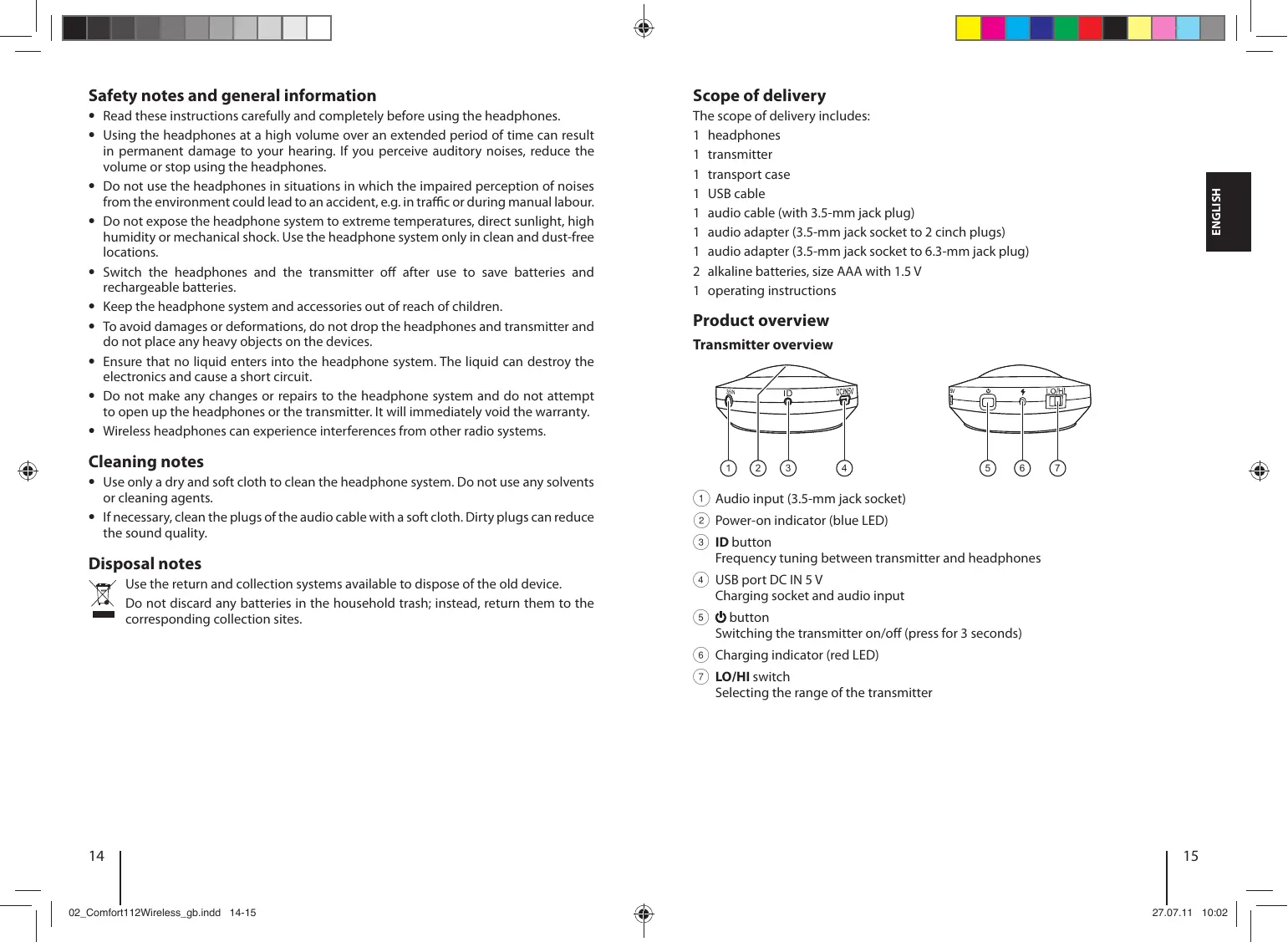 Using the headphones at a high volume over an extended period of time can result in permanent damage to your hearing. If you perceive auditory noises, reduce the volume or stop using the headphones. Do not use the headphones in situations in which the impaired perception of noises from the environment could lead to an accident, e.g. in traffic or during manual labour. Do not expose the headphone system to extreme temperatures, direct sunlight, high humidity or mechanical shock. Use the headphone system only in clean and dust-free locations. Switch the headphones and the transmitter off after use to save batteries and rechargeable batteries. Keep the headphone system and accessories out of reach of children. To avoid damages or deformations, do not drop the headphones and transmitter and do not place any heavy objects on the devices. Ensure that no liquid enters into the headphone system. The liquid can destroy the electronics and cause a short circuit. Do not make any changes or repairs to the headphone system and do not attempt to open up the headphones or the transmitter. It will immediately void the warranty. Wireless headphones can experience interferences from other radio systems.