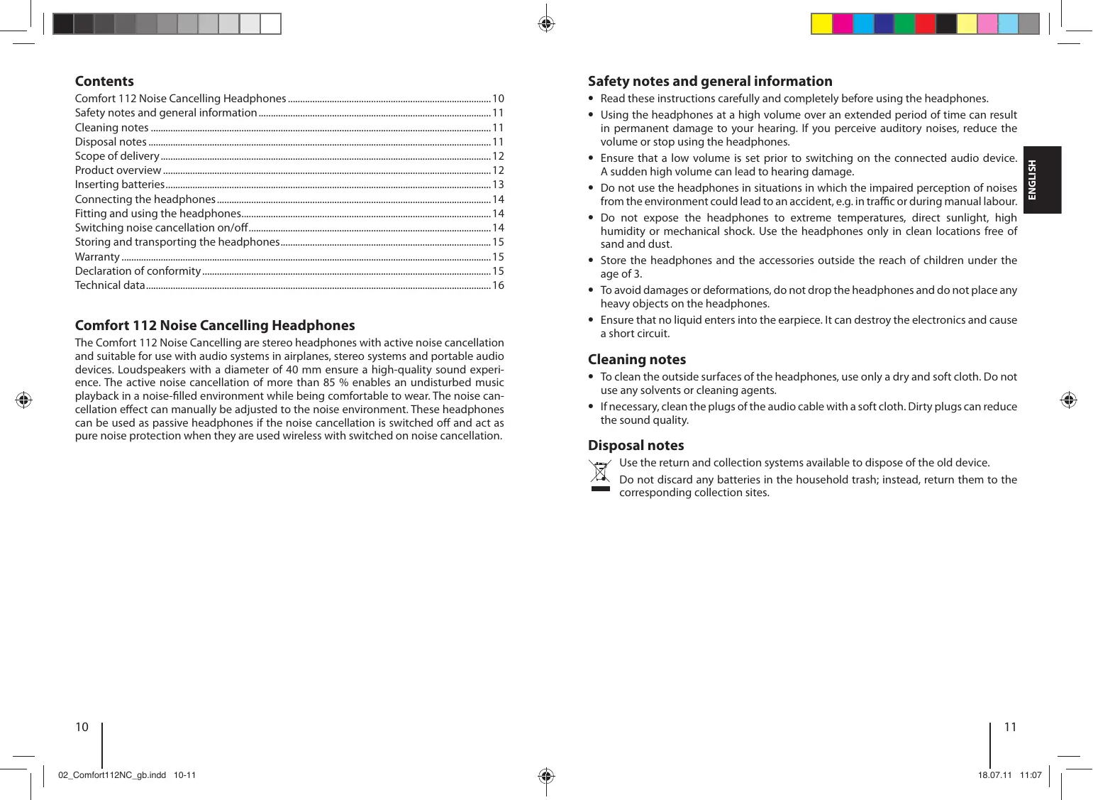 1 Comfort 112 Noise Cancelling Headphones 1 transport case 1 headphones audio cable 1 audio adapter (6.3-mm stereo jack plug) 1 airplane adapter (2 x 3.5-mm jack plug) 2 alkaline batteries, size AAA with 1.5 V 1 operating instructions