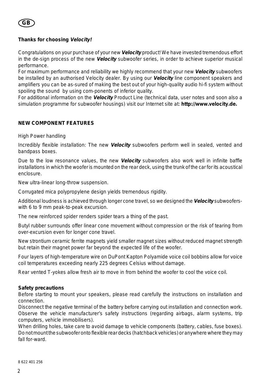 GB Thanks for choosing Velocity! Congratulations on your purchase of your new Velocity product! We have invested tremendous effort in the de-sign process of the new Velocity subwoofer series, in order to achieve superior musical performance. For maximum performance and reliability we highly recommend that your new Velocity subwoofers be installed by an authorised Velocity dealer. By using our Velocity line component speakers and amplifiers you can be as-sured of making the best out of your high-quality audio hi-fi system without spoiling the sound by using com-ponents of inferior quality. For additional information on the Velocity Product Line (technical data, user notes and soon also a simulation programme for subwoofer housings) visit our Internet site at: http://www.velocity.de.