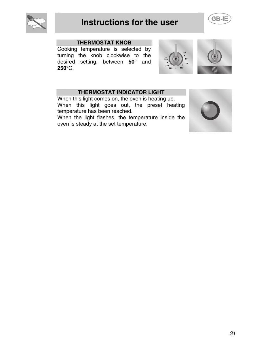 Instructions for the user THERMOSTAT KNOB Cooking temperature is selected by turning the knob clockwise to the desired setting, between 50° and « an 250°C. me 0e)