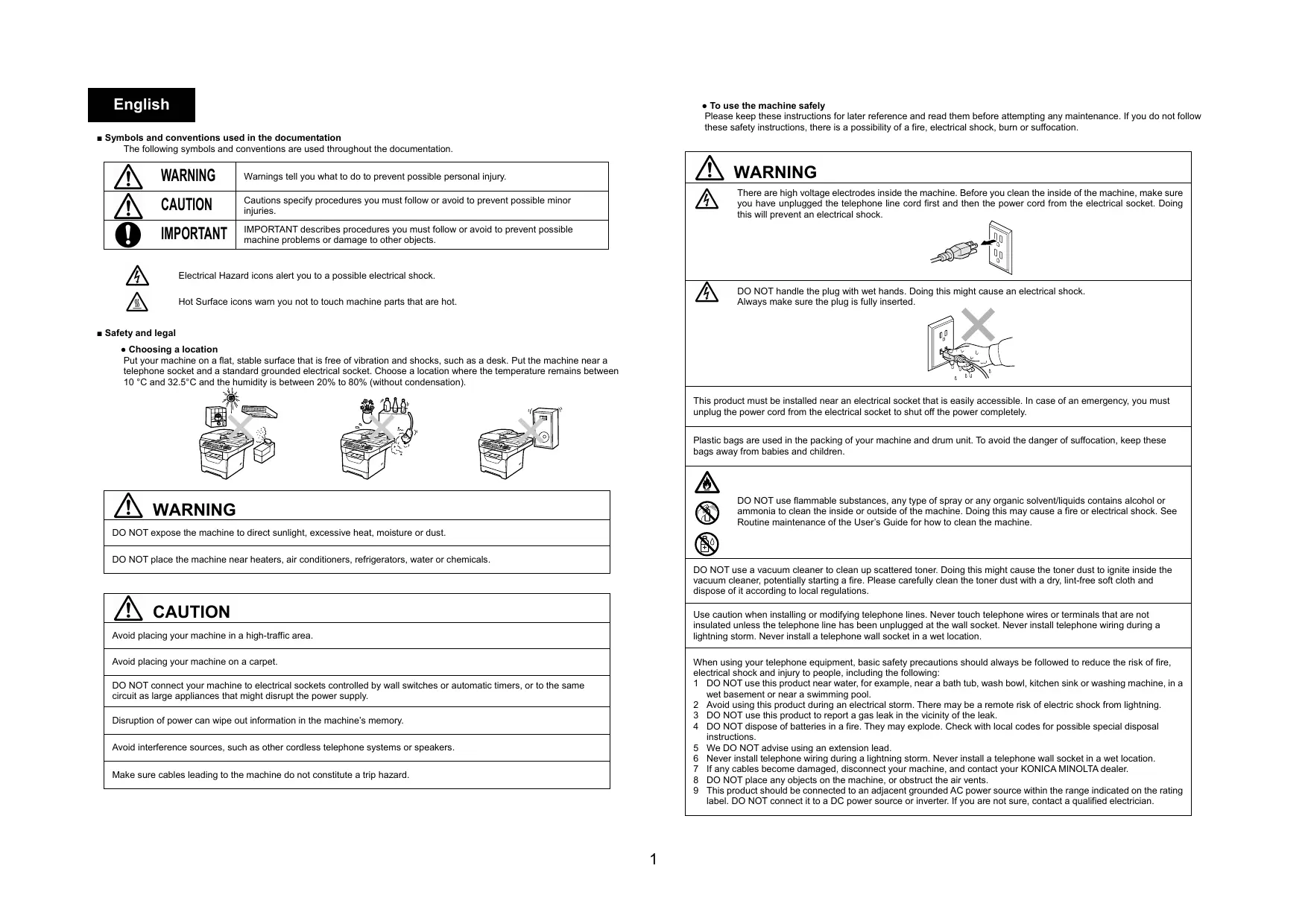 A32R-9230-02 The essentials of imaging konicaminolta.com English ● To use the machine safely Please keep these instructions for later reference and read them before attempting any maintenance. If you do not follow these safety instructions, there is a possibility of a fire, electrical shock, burn or suffocation. ■ Symbols and conventions used in the documentation The following symbols and conventions are used throughout the documentation. WARNING Warnings tell you what to do to prevent possible personal injury. CAUTION Cautions specify procedures you must follow or avoid to prevent possible minor injuries. IMPORTANT IMPORTANT describes procedures you must follow or avoid to prevent possible machine problems or damage to other objects. WARNING There are high voltage electrodes inside the machine. Before you clean the inside of the machine, make sure you have unplugged the telephone line cord first and then the power cord from the electrical socket. Doing this will prevent an electrical shock. Electrical Hazard icons alert you to a possible electrical shock. DO NOT handle the plug with wet hands. Doing this might cause an electrical shock. Always make sure the plug is fully inserted. Hot Surface icons warn you not to touch machine parts that are hot. ■ Safety and legal ● Choosing a location Put your machine on a flat, stable surface that is free of vibration and shocks, such as a desk. Put the machine near a telephone socket and a standard grounded electrical socket. Choose a location where the temperature remains between 10 °C and 32.5°C and the humidity is between 20% to 80% (without condensation). This product must be installed near an electrical socket that is easily accessible. In case of an emergency, you must unplug the power cord from the electrical socket to shut off the power completely. Plastic bags are used in the packing of your machine and drum unit. To avoid the danger of suffocation, keep these bags away from babies and children. DO NOT use flammable substances, any type of spray or any organic solvent/liquids contains alcohol or ammonia to clean the inside or outside of the machine. Doing this may cause a fire or electrical shock. See Routine maintenance of the User’s Guide for how to clean the machine. WARNING DO NOT expose the machine to direct sunlight, excessive heat, moisture or dust. DO NOT place the machine near heaters, air conditioners, refrigerators, water or chemicals. DO NOT use a vacuum cleaner to clean up scattered toner. Doing this might cause the toner dust to ignite inside the vacuum cleaner, potentially starting a fire. Please carefully clean the toner dust with a dry, lint-free soft cloth and dispose of it according to local regulations. CAUTION Use caution when installing or modifying telephone lines. Never touch telephone wires or terminals that are not insulated unless the telephone line has been unplugged at the wall socket. Never install telephone wiring during a lightning storm. Never install a telephone wall socket in a wet location. Avoid placing your machine in a high-traffic area. Avoid placing your machine on a carpet. When using your telephone equipment, basic safety precautions should always be followed to reduce the risk of fire, electrical shock and injury to people, including the following: 1 DO NOT use this product near water, for example, near a bath tub, wash bowl, kitchen sink or washing machine, in a wet basement or near a swimming pool. 2 Avoid using this product during an electrical storm. There may be a remote risk of electric shock from lightning. 3 DO NOT use this product to report a gas leak in the vicinity of the leak. 4 DO NOT dispose of batteries in a fire. They may explode. Check with local codes for possible special disposal instructions. 5 We DO NOT advise using an extension lead. 6 Never install telephone wiring during a lightning storm. Never install a telephone wall socket in a wet location. 7 If any cables become damaged, disconnect your machine, and contact your KONICA MINOLTA dealer. 8 DO NOT place any objects on the machine, or obstruct the air vents. 9 This product should be connected to an adjacent grounded AC power source within the range indicated on the rating label. DO NOT connect it to a DC power source or inverter. If you are not sure, contact a qualified electrician. DO NOT connect your machine to electrical sockets controlled by wall switches or automatic timers, or to the same circuit as large appliances that might disrupt the power supply. Disruption of power can wipe out information in the machine’s memory. Avoid interference sources, such as other cordless telephone systems or speakers. Make sure cables leading to the machine do not constitute a trip hazard.