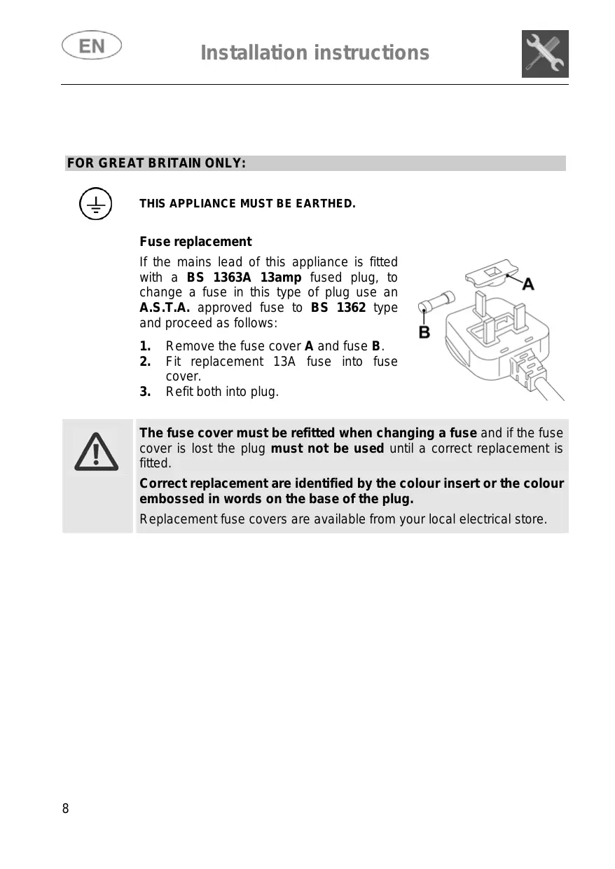 CEN ) Installation instructions FOR GREAT BRITAIN ONLY: eo) THIS APPLIANCE MUST BE EARTHED. Fuse replacement If the mains lead of this appliance is fitted with a BS 1363A 13amp fused plug, to change a fuse in this type of plug use an A.S.T.A. approved fuse to BS 1362 type and proceed as follows: 1 Remove the fuse cover A and fuse B.