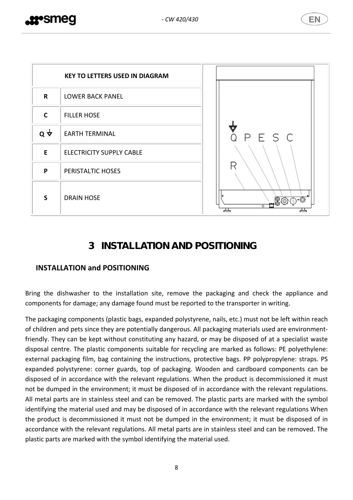 INSTALLATION and POSITIONING Bring the dishwasher to the installation site, remove the packaging and check the appliance and components for damage; any damage found must be reported to the transporter in writing. The packaging components (plastic bags, expanded polystyrene, nails, etc.) must not be left within reach of children and pets since they are potentially dangerous. AIl packaging materials used are environment- friendly. They can be kept without constituting any hazard, or may be disposed of at a specialist waste disposal centre. The plastic components suitable for recycling are marked as follows: PE polyethylene: external packaging film, bag containing the instructions, protective bags. PP polypropylene: straps. PS expanded polystyrene: corner guards, top of packaging. Wooden and cardboard components can be disposed of in accordance with the relevant regulations. When the product is decommissioned it must not be dumped in the environment; it must be disposed of in accordance with the relevant regulations. All metal parts are in stainless steel and can be removed. The plastic parts are marked with the symbol identifying the material used and may be disposed of in accordance with the relevant regulations When the product is decommissioned it must not be dumped in the environment; it must be disposed of in accordance with the relevant regulations. All metal parts are in stainless steel and can be removed. The plastic parts are marked with the symbol identifying the material used.